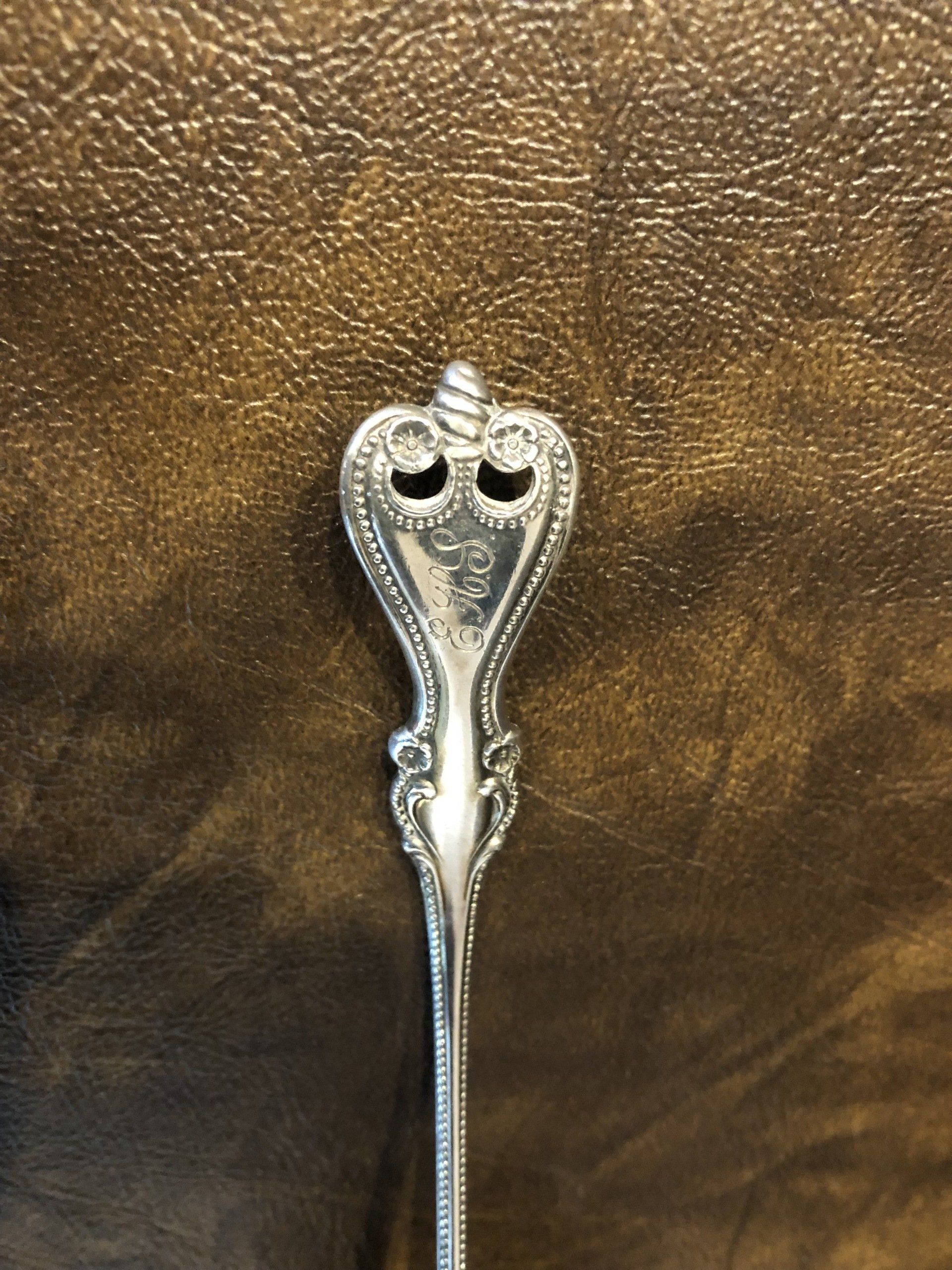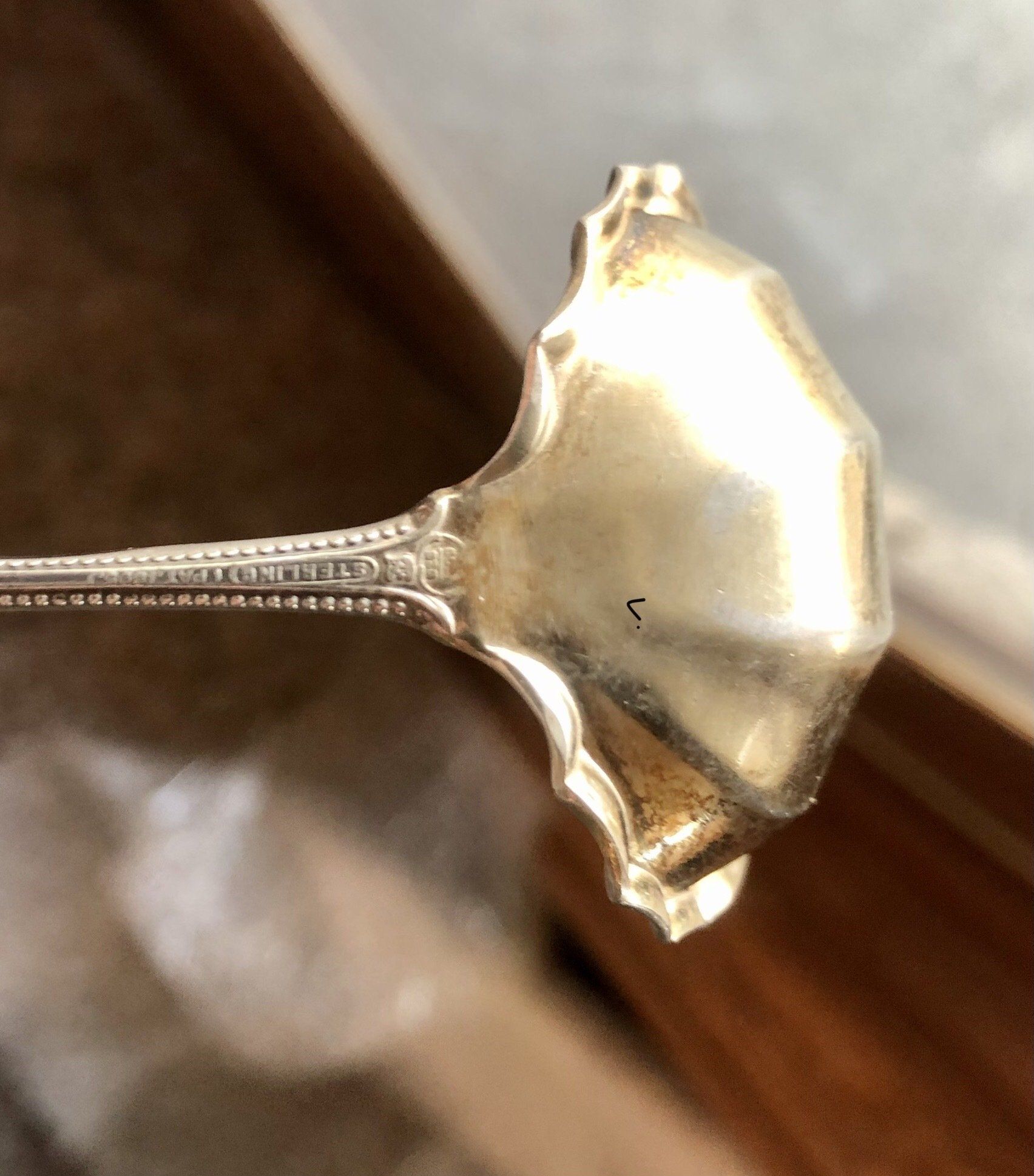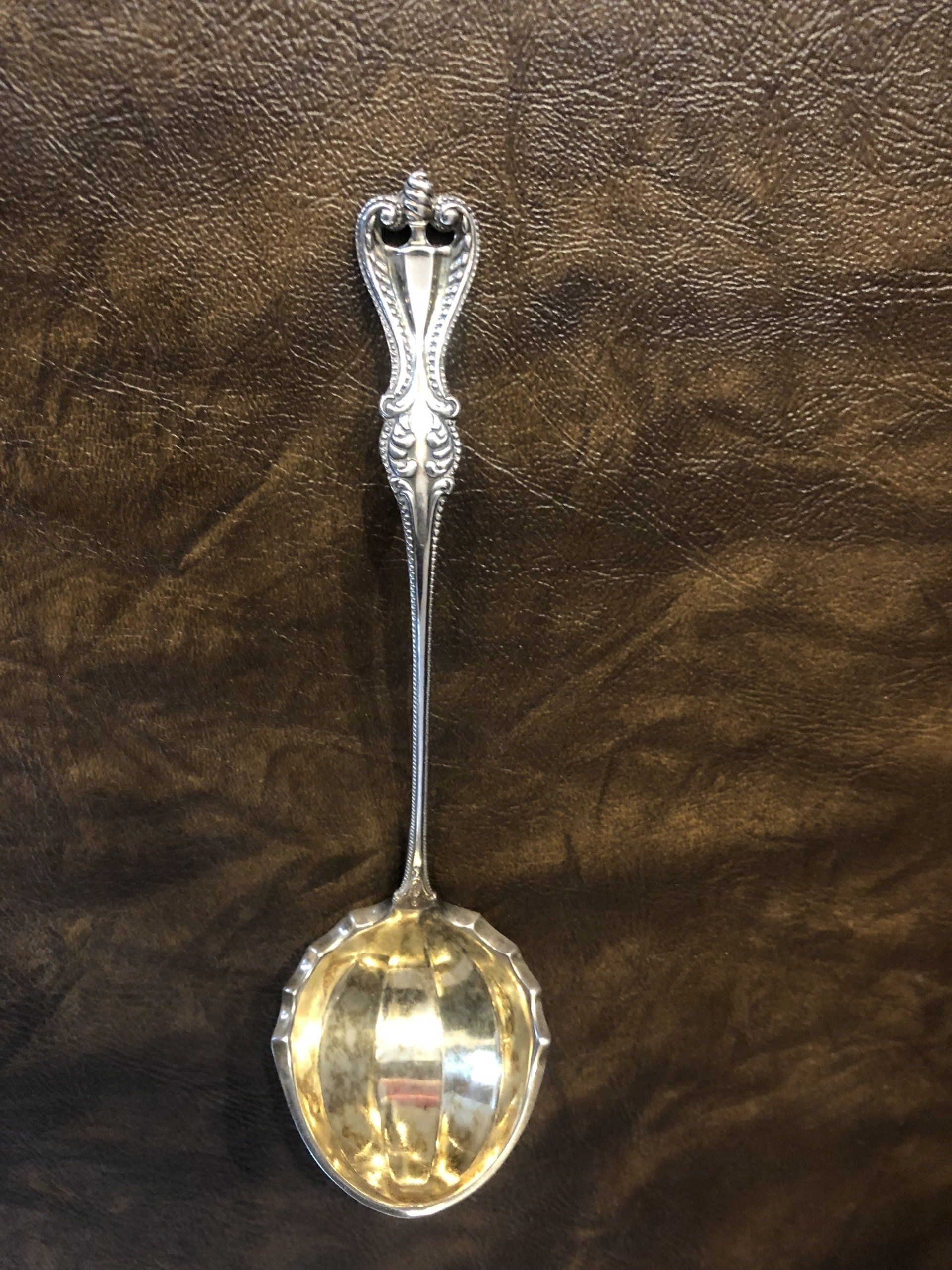 M2049. American Towle Old Colonial pattern monogrammed vermeil sterling silver cream ladle. First issued in 1895, Towle's Old Colonial pattern reflects a Neoclassical influence from Colonial America, presented with a flanged fluted bowl, recalling architectural columnar shafts, dipping from a handle molded with two elongated beaded “C” scrolls enclosing a slender waisted lower shaft, and the upper shaft rounding between two small beaded “C” scrolls underlying an ogee-molded end punctuated with two beaded serpentine-scrolls flanking a paneled urn having a dramatic flame finial cut-out between the scrolls to suggest a “broken pediment” recalling the Early American case furniture.