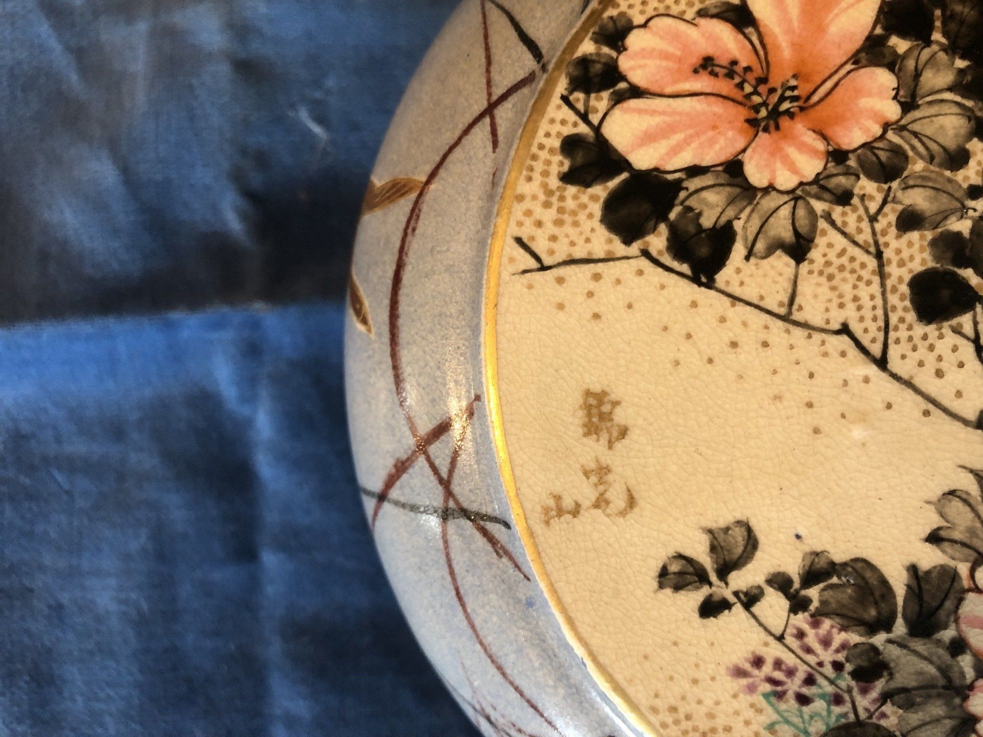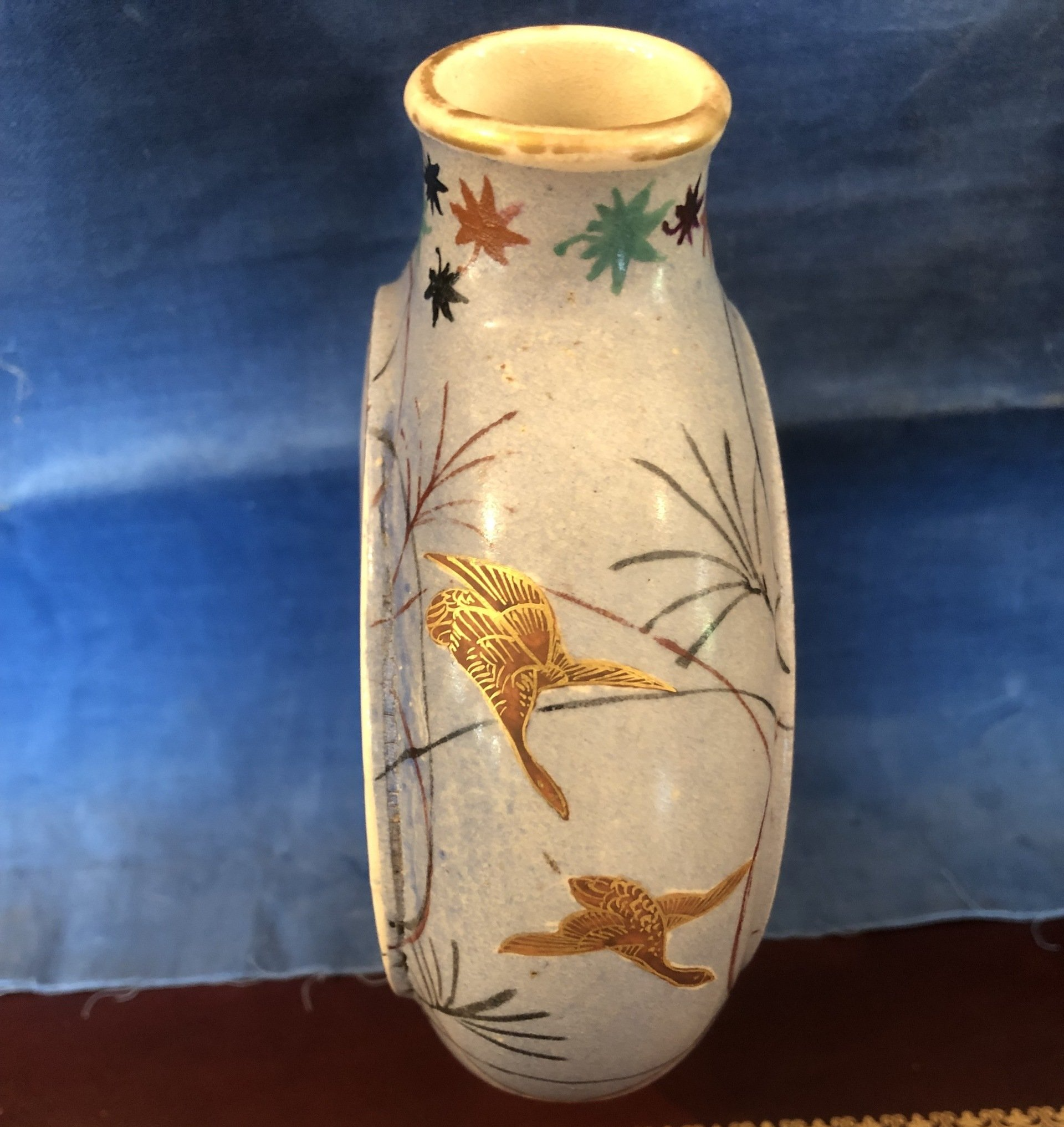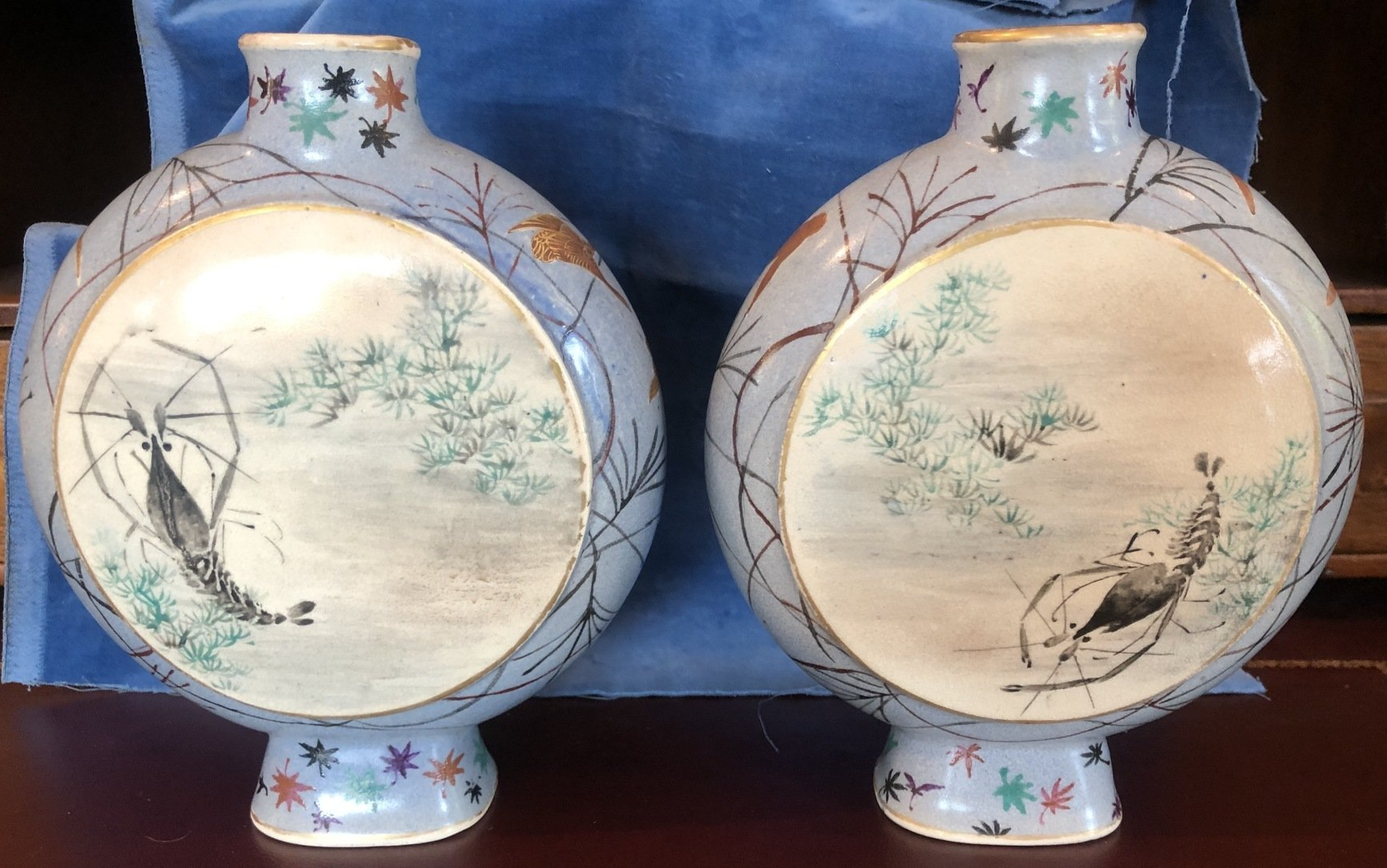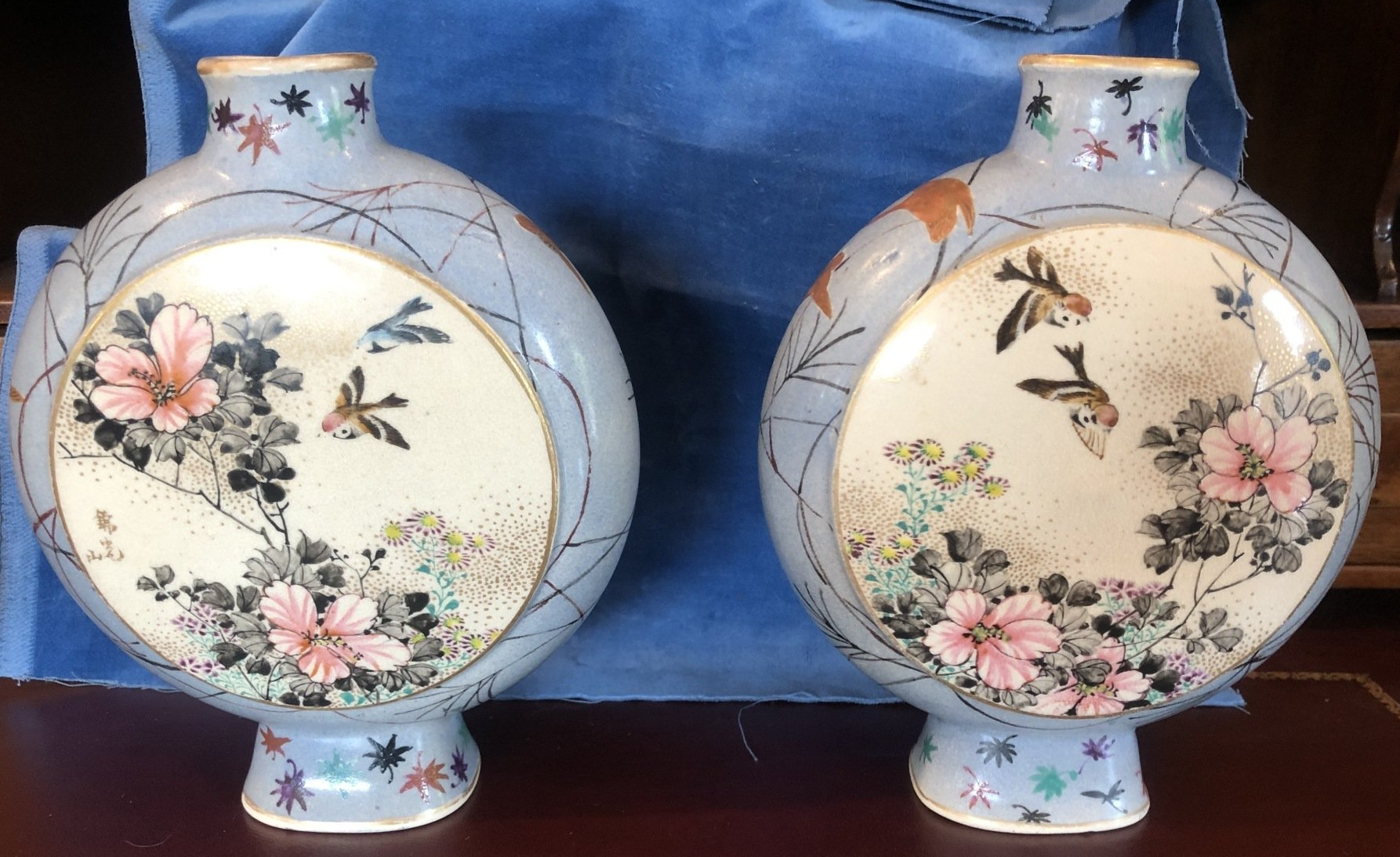 C3662. Fine pair of Japanese signed Kinkosan Satsuma painted pottery moon vases, round cushion-forms, symmetrically decorated with opposing large round scenic reserves raised upon a light blue-grey ground that is strewn with grasses and geese in flight between small colorful maple leaves sprinkled on a short lipped neck and a tall flared oblong foot. As a finishing touch, the reserves, the neck and the foot are lined in metallic-gold.