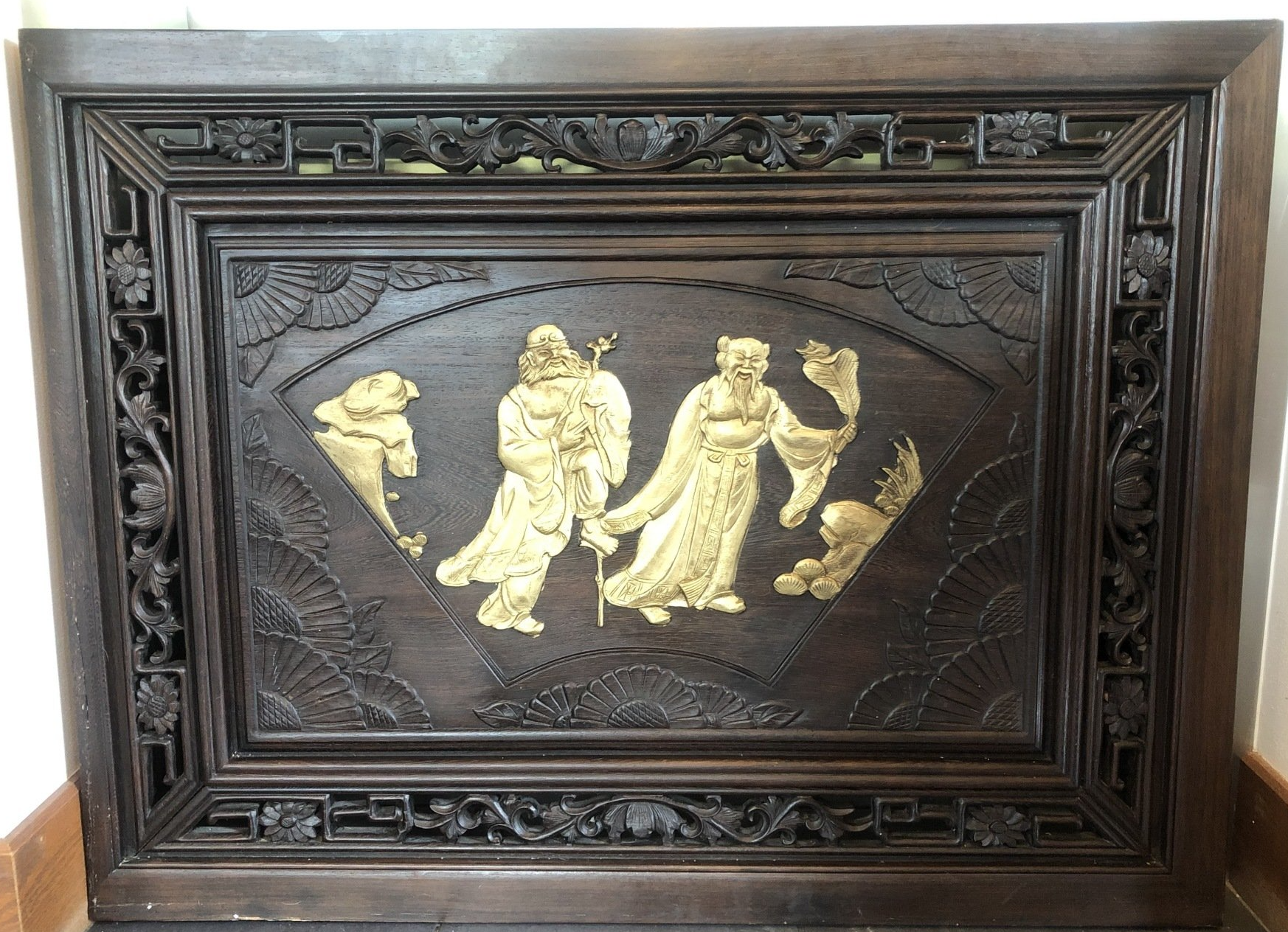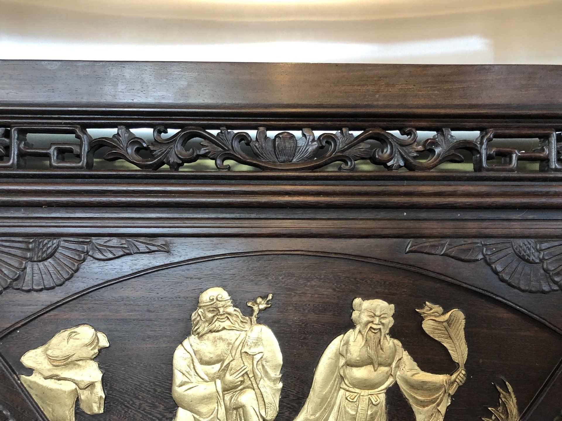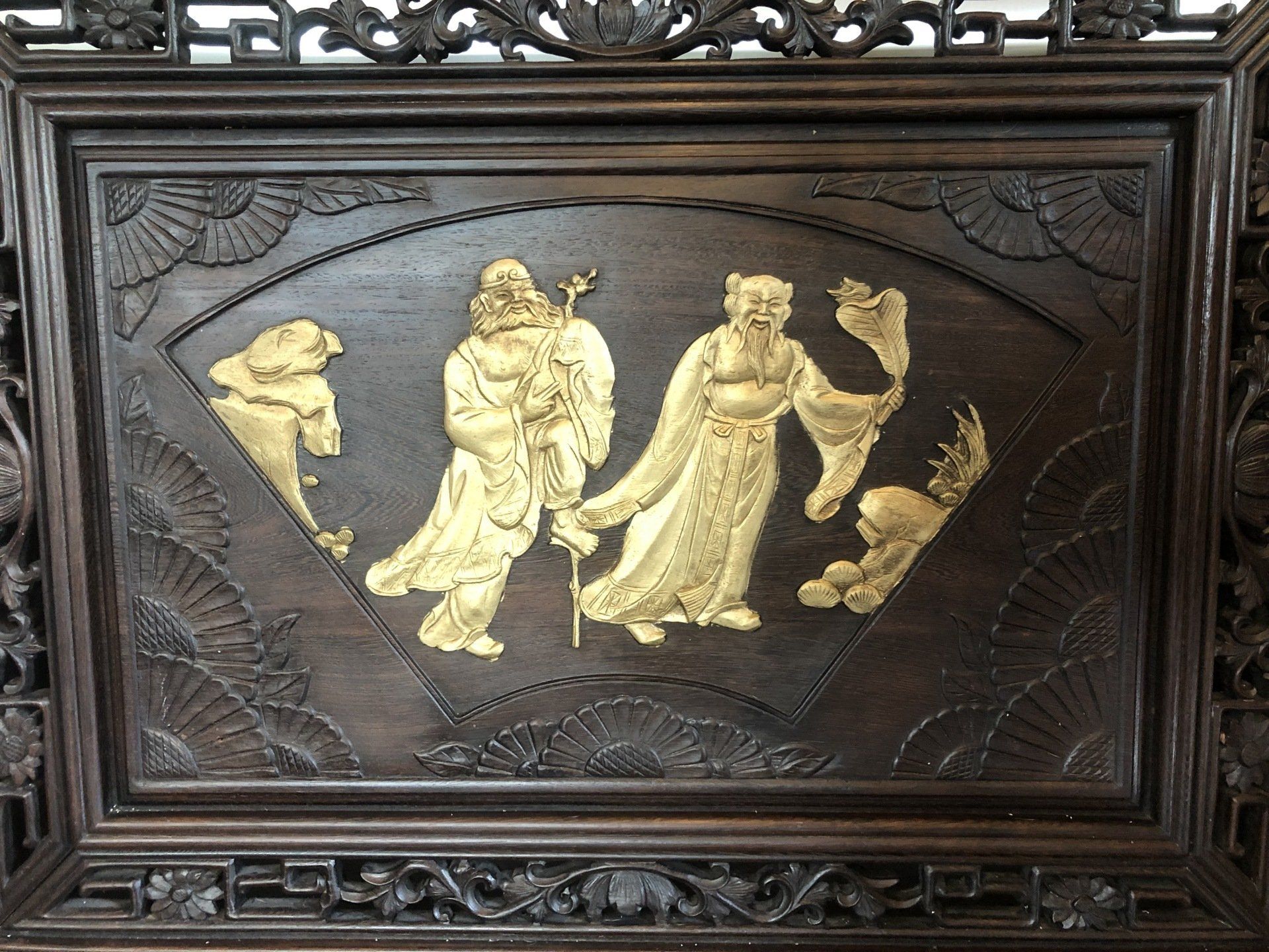 OR3. Chinese double-sided carved and gilded rosewood panel, decorated on each side with a scene of Chung-li Ch’üan and Li T’eh-kuai, two of the eight immortals in the Pa Hsien, legendary beings in the Taoist sect, accompanied by auspicious emblems of longevity and bounty.
