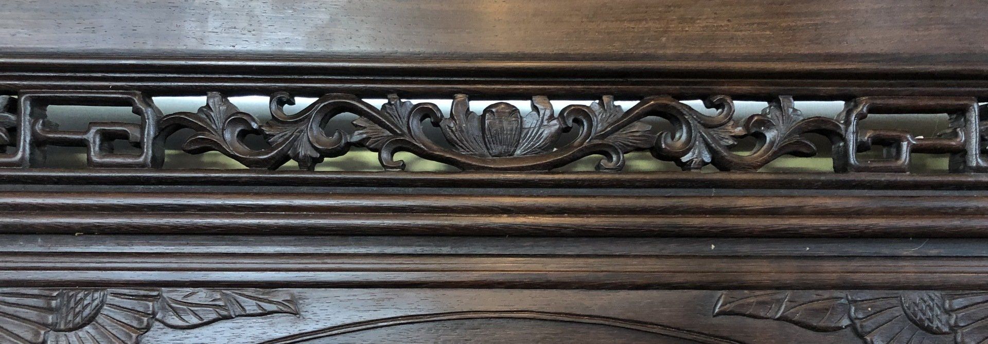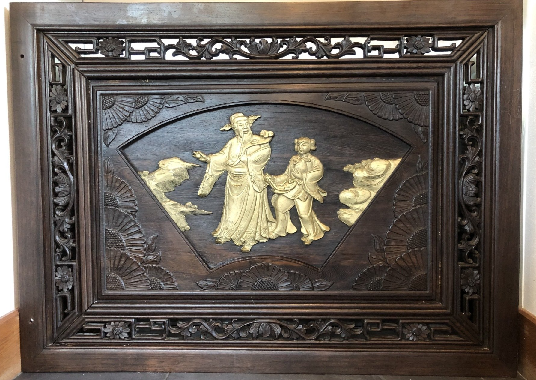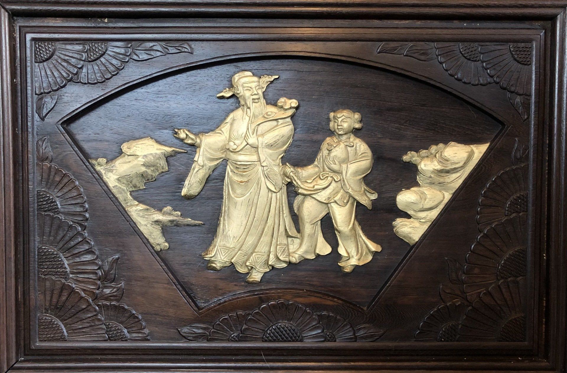 OR3. Chinese double-sided carved and gilded rosewood panel, decorated on each side with a scene of Chung-li Ch’üan and Li T’eh-kuai, two of the eight immortals in the Pa Hsien, legendary beings in the Taoist sect, accompanied by auspicious emblems of longevity and bounty.