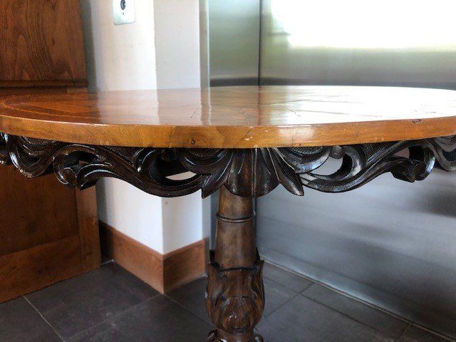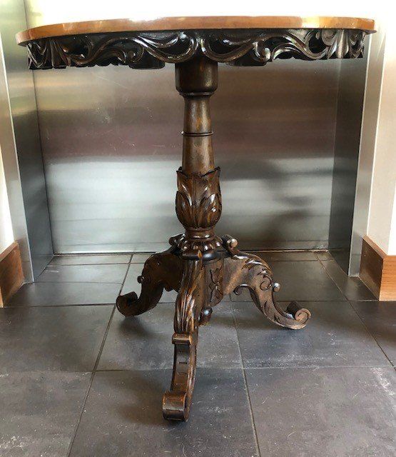 European marquetry game table, having an inlaid tilt-top decorated with a chessboard centering two square fields and six stars, skirted by a pierce-carved acanthus-scroll skirt, and supported on a richly carved acanthus-carved tripod base. Dating is late 19th to early 20th century. Poplar with sapwood and mahogany inlays to a fruitwood surfaced top. Measures 29” tall and 27.5” diameter. SOLD