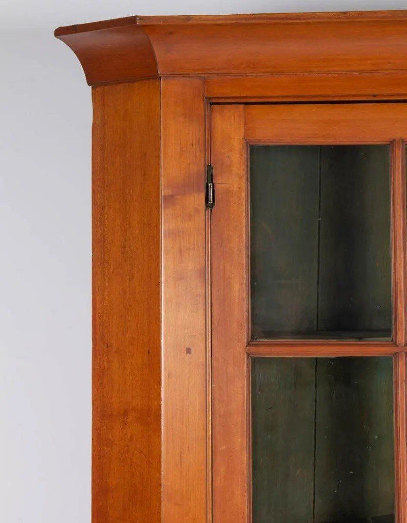 Dating is c. 1820-1840. Poplar secondary wood. Older refinished surface with warm golden-red color. The interior has an old light-blue painted surface. Good overall condition. One pane of glass has an old break, the proper right door upper hinge has an old repair. Measures 86" tall, 52 ½" wide, and fits a 30 ½" wide corner.