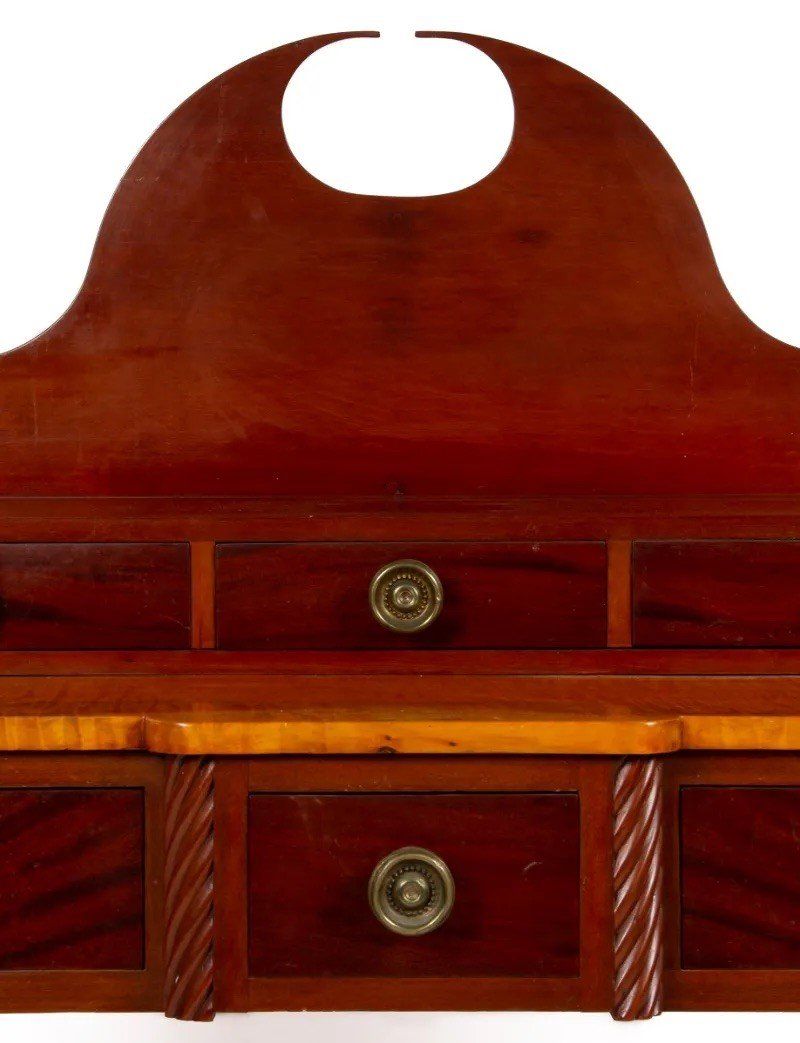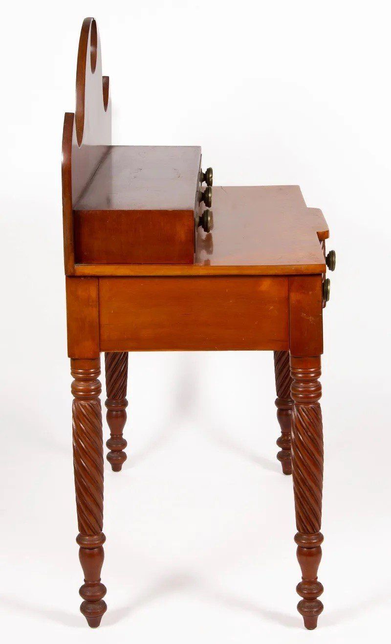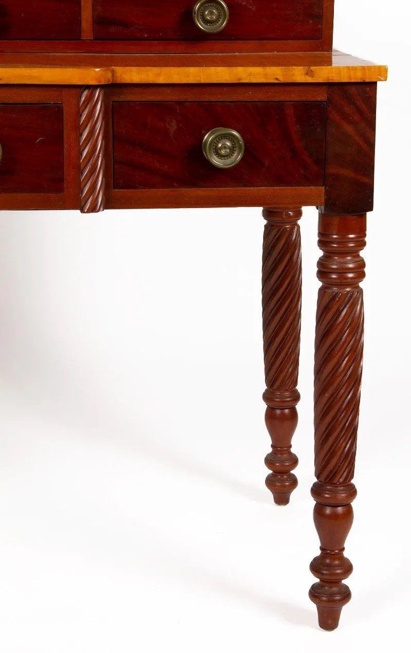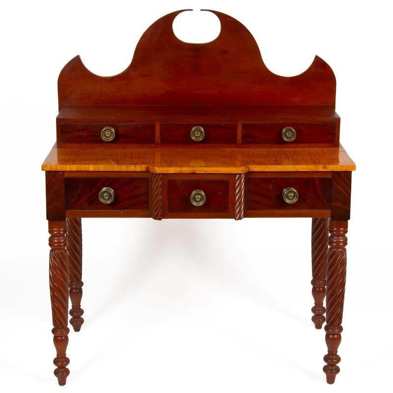 Bold American early 19th century server, cherry with tiger-maple and flame-figured mahogany, a double-tiered form, having a tall deeply scrolled serpentine-shaped back-piece, above a short case fitted with a bank of three dovetailed drawers, resting upon a deeper block-front flame-figured mahogany case with a remarkable tiger-maple top, fitted with a central drawer projecting with quartered roped pilasters between two small dovetailed drawers, supported by spiral-turned legs embellished with baluster-and ring turnings. Original brass drawer pulls.
