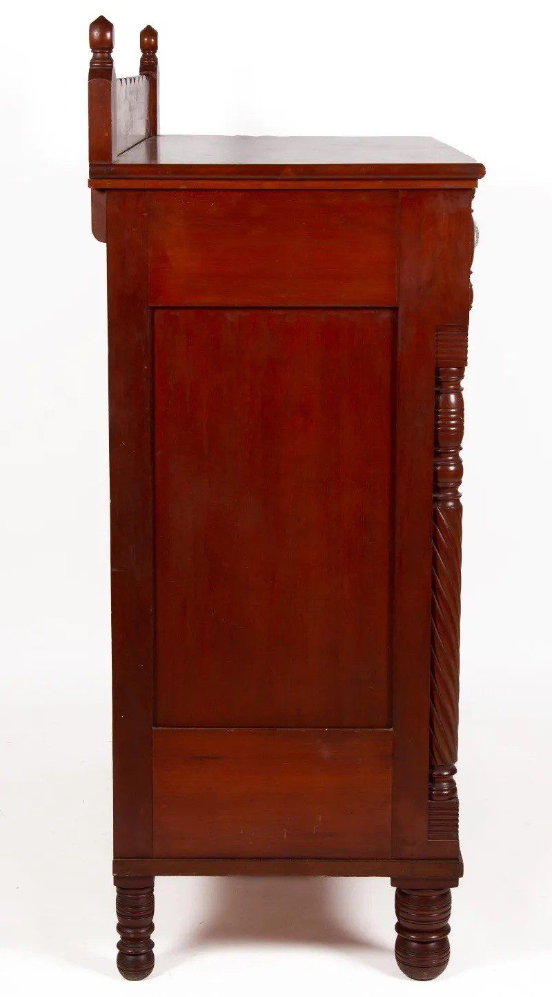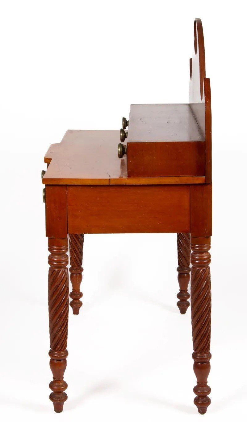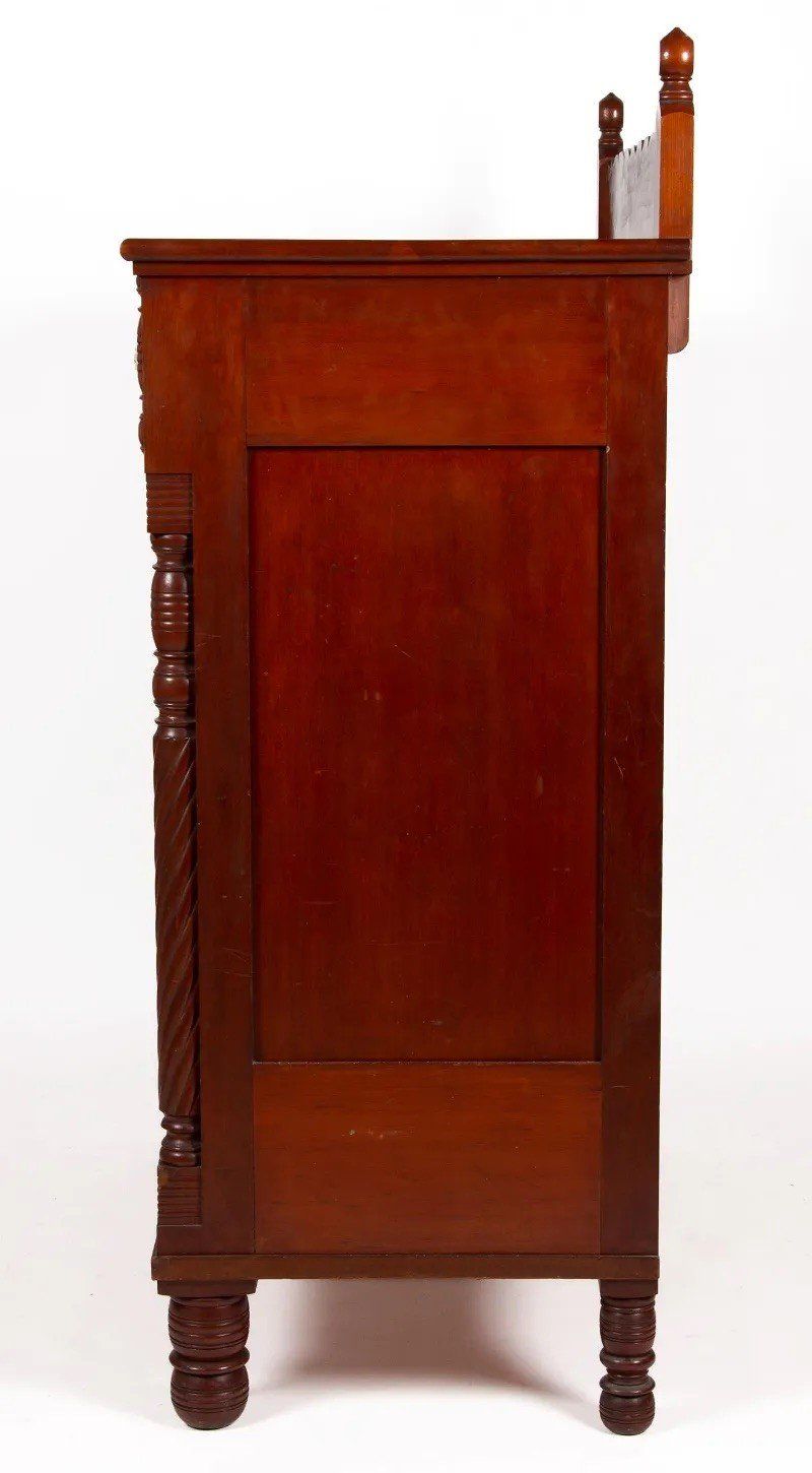 Bold American early 19th century server, cherry with tiger-maple and flame-figured mahogany, a double-tiered form, having a tall deeply scrolled serpentine-shaped back-piece, above a short case fitted with a bank of three dovetailed drawers, resting upon a deeper block-front flame-figured mahogany case with a remarkable tiger-maple top, fitted with a central drawer projecting with quartered roped pilasters between two small dovetailed drawers, supported by spiral-turned legs embellished with baluster-and ring turnings. Original brass drawer pulls.