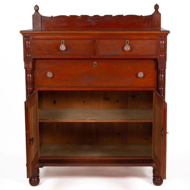 American country cherry jelly cupboard, having a distinctive notched serpentine-shaped backpiece flanked by posts with acorn-finials, a rectangular overhanging top with molded frieze, set upon a case fitted with a pair of short dovetailed cock-beaded drawers flanked by turned half-pilasters, above a long cock-beaded recessed drawer over a cabinet with a fixed shelf enclosed by two hinged fielded panel doors, flanked by columns with spooled ring and rope turnings between distinctive four-part square blocks, above a cove-molded plinth on robust grooved ball-and-ring turned legs. Recessed panel sides. The drawers have their original press-molded glass pulls.