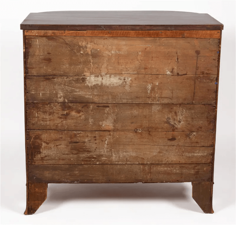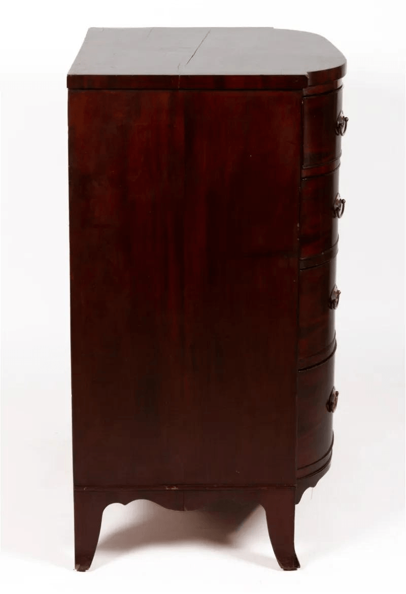 American Federal mahogany swell-front chest of drawers, probably Northern Virginia or Maryland, having a notched “D”-form top, overhanging a conforming case fitted with four graduated cock-beaded dovetailed drawers retaining their original silver-plated bale-pulls with oval back-plates, flanked by distinctive stiles carved with reeded ovals, raised on flared French feet with a modified serpentine-shaped valence.