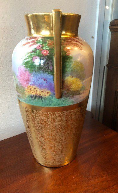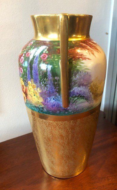 American Pickard Studio decorated porcelain vase, hand-painted and artist signed by Louis Falatek using a Bavarian black, having a short flared neck drawn from shouldered swelling cylindrical walls, mounted with two detached angled side handles rising from the shoulders and returning to the lip. Above a wide band of acid-cut back sponged metallic-gold covering the lower walls, the upper walls are circumscribed by an artist signed scene depicting a lush garden flowering in shades of purple, pink, orange and yellow, overlooking the edge of a pale-blue lake with a light-purple forested shore in the distance. The neck and the handles are gilded.