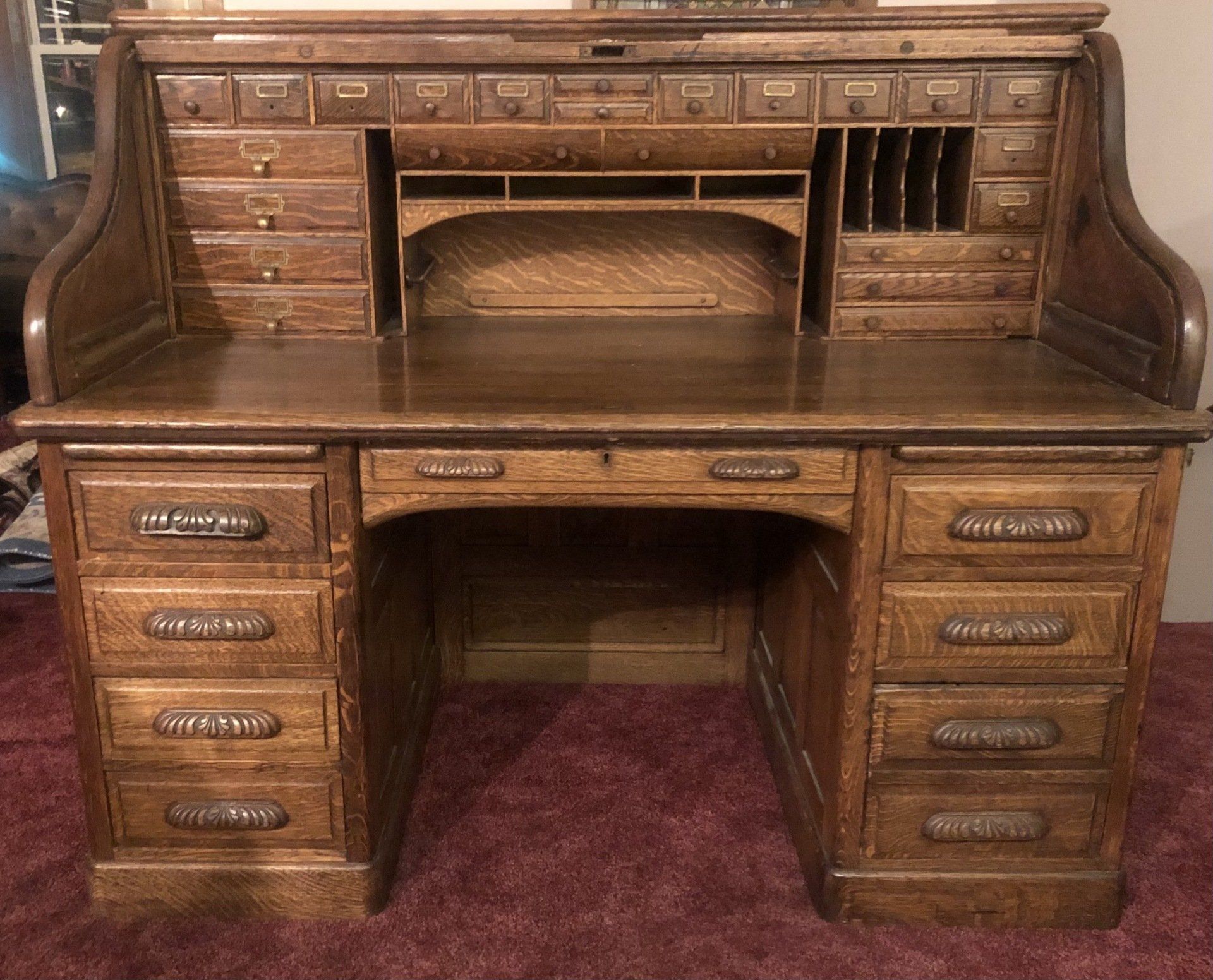 F282. American roll-top desk, crafted in quarter-sawn oak, having a paneled case with a finished back, having an upper case with a molded top above a serpentine-shaped slatted tambour lid enclosing a generous writing surface flanked by mail-slots and letter racks on either side, centering a large set of cubby-holes and drawers, supported on a twin pedestal base comprised of a long narrow molded drawer above a knee-hole recess, flanked by two cases each fitted with molded drawers stacked below a pull-out writing tablet, molded above a rounded base-board.