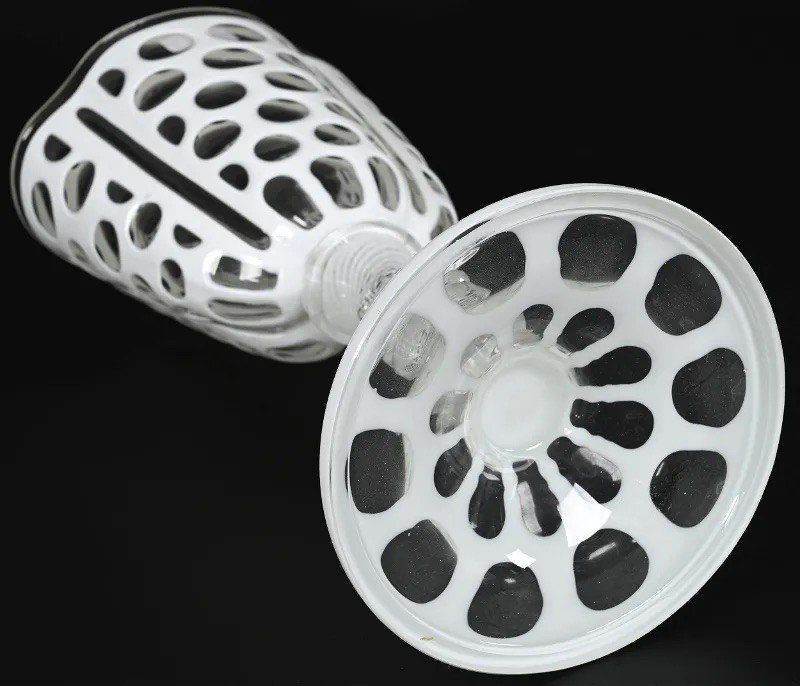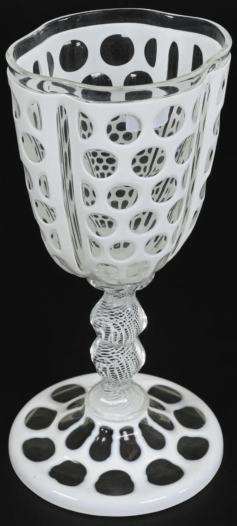 Exceptional Bohemian wheel-cut opaline cased colorless glass chalice, having an opaline-cased-colorless Thousand Eye design with punties ornamenting a quatrefoil-form punty-cut bowl and a flattened conical foot, joined with a superb faceted double-baluster-form colorless enamel-twist stem decorated with nested opaline helixes. Dating is c. 1840-1880. Measures 10 ½" tall and 5" diameter.