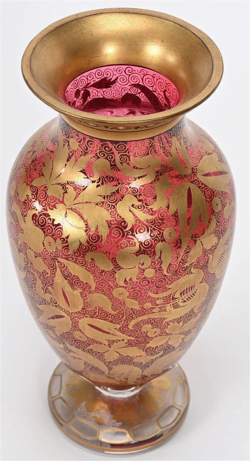 Bohemian gilded and wheel-cut ruby-gold cased glass footed vase, a colloidial gold-based cranberry-red colored glass cased in colorless, blown with a graceful waisted neck drawn from an oviform, richly circumscribed in metallic-gold by honeysuckle foliage strewn upon a field of scrolls, bounded by a wide metallic-gold upper border wrapping over the inner surface and embellished in black accented with white by a lined foliate band of oval blossoms chained with leafy-branches, and a basal band of wheel-cut gold-lined flutes; supported by a colorless flattened conical foot reprising the design with a gilded honeysuckle and scroll field bounded by gold-lined flutes. Wheel-polished bottom.