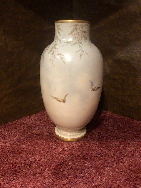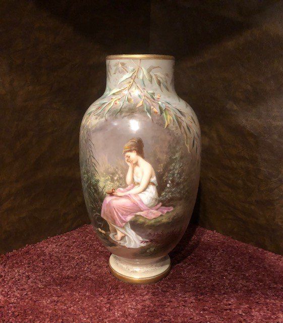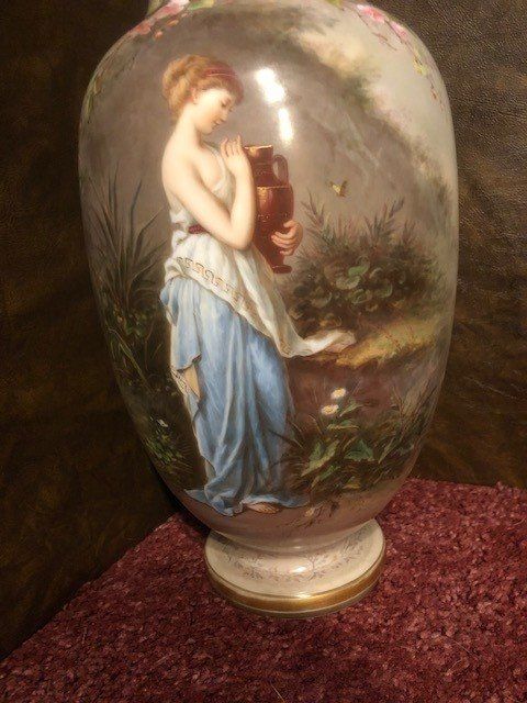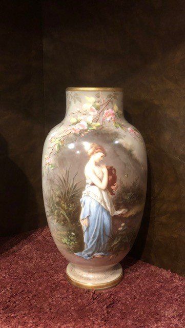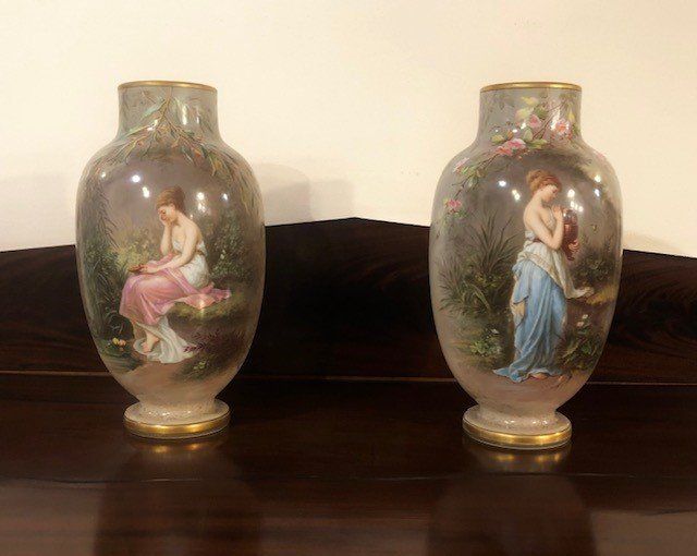 Blown-molded from opaline-glass to suggest porcelain, each vase has a graceful baluster-shape, springing from a low round waisted foot, richly adorned in an impressionistic romantic style with a large oval reserve against a pale green etheral ground with two blue-birds cavorting in flight amongst others on the reverse, narrowly bordered in metallic-gold, crisply edged in dark-brown, and finished with a vine circumscribing the waisted foot bearing tiny pink flowers and small light-brown leaves. The reserves are symmetrically composed, influenced by the Italian Old Master painting, each featuring a young contemplative woman in a long robe, barefoot, wearing a head-band securing long blonde hair gathered upon her head, holding a small dark-brown earthenware vessel in a small clearing with a low earthen embankment, amongst flowering plants and low vegetation receding into a grey background, and mantled by a pair of flowering branches which is repeated in shadow on the reverse.