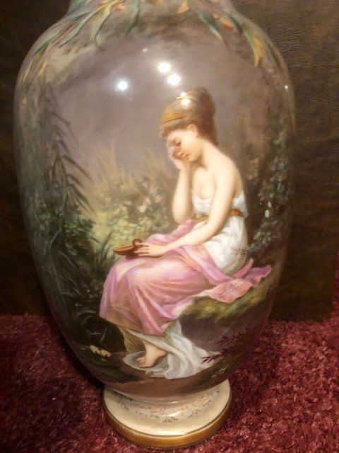 The reserve on the other vase depicts a young woman also standing in three-quarter perspective in front of a grassy embankment on the right, gazing down full of thought into the depths of a footed double-handled vase which she holds to her breast, flanked by hosta-type plants and a butterfly hovering above a fern behind her, and by white-flowering wild-flowers in the foreground. She wears a white robe trimmed with gold Greek-key, belted in magenta patterned with gold Greek-key, and a light-blue apron. Above are two apple-tree branches flowering in pink.