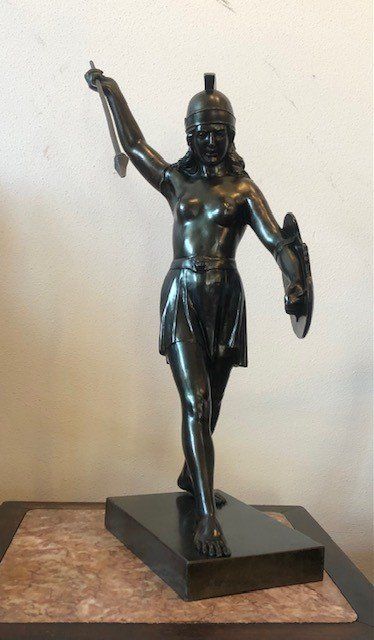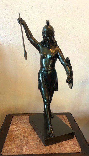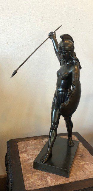 Pair of Classical Revival bronze-patinated spelter female warriors with spears, each striding bare-chested upon a rectangular plinth, holding a spear aloft with one hand and wielding a small shaped shield with the other, wearing a Greco-Roman style helmet and a short belted skirt buckled with a lion’s head. The bronze patination has light wear and the spears have minor rust. Weighted rectangular bases. Early 20th century.
