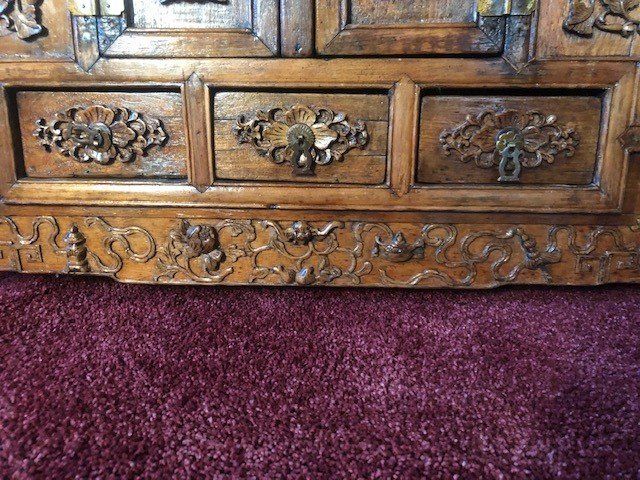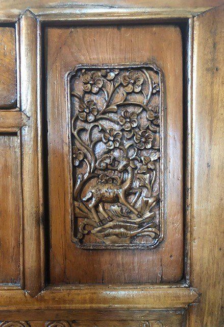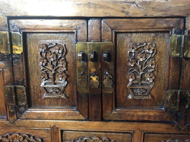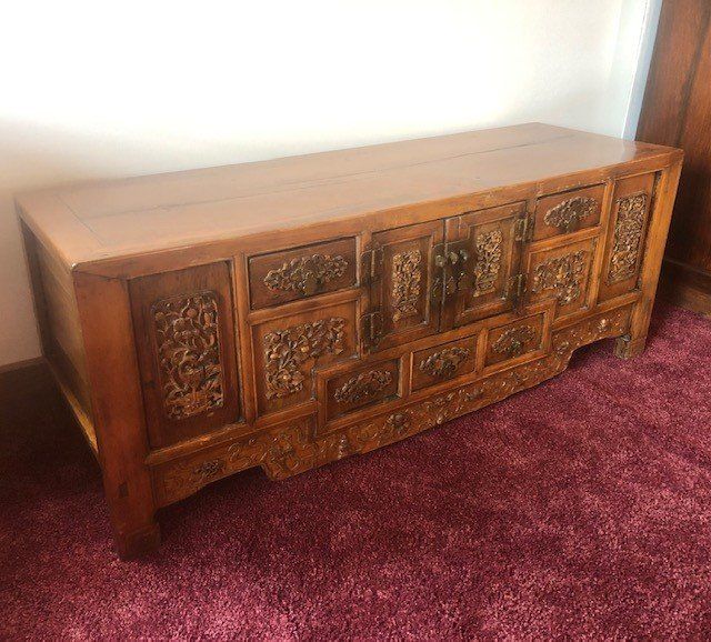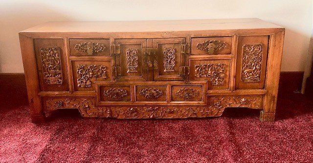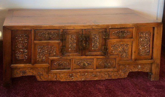 Chinese pine kang cabinet, fitted with small drawers and panels flanking a small compartment enclosed by doors, carved in relief with auspicious emblems including those from the Pa pao and deer. Original brass hardware including flower-basket drop-pulls for the drawers. The end panels are removable and conceal hidden compartments. Nineteenth century. Good overall condition. Older golden colored surface. Measures 20" tall x 52" long x 17 ½" deep.