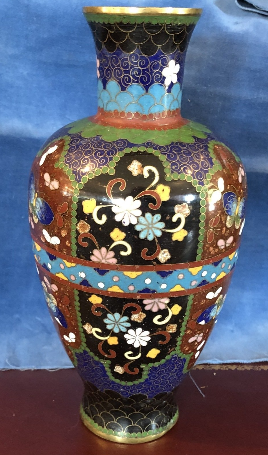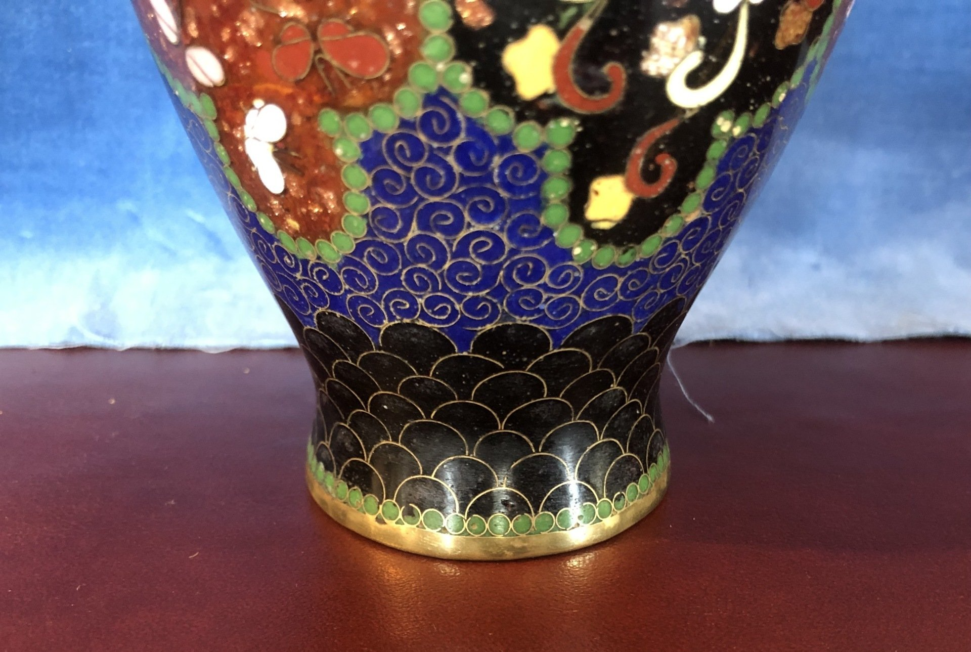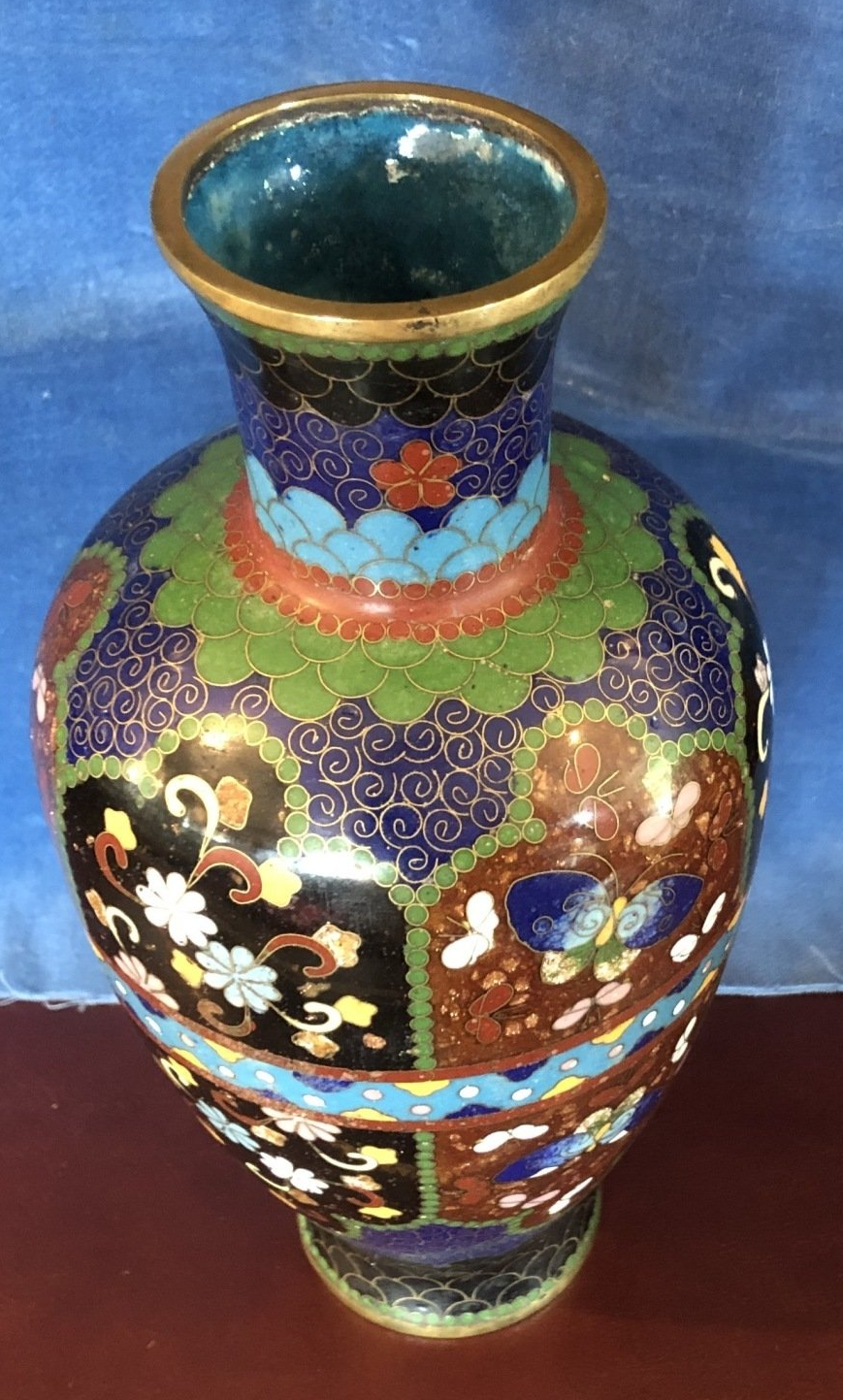OR1. Japanese cloisonne enameled brass vase, drawing on the Chinese for the meiping shape, this vase is circumscribed by six shaped light-green beaded reserves against a sapphire-blue ground of scrolls, alternatively decorated with butterflies against a rust-red background sprinkled with aventurine or chrysanthemum-scroll against a black background. The waised foot is finished with black-scale underlined by light-green beading. The sapphire-blue scroll ground on the walls continues over the neck, sprinkled with white flowerheads, bordered by scaled bands in black, light-blue and light-green. Dating is late 19th to early 20th century. Good overall condition with a small dent at the bottom of the walls. Measures 7.75" tall and 3.5" diameter.