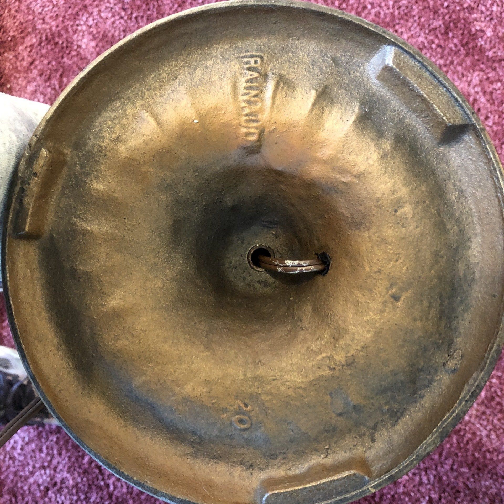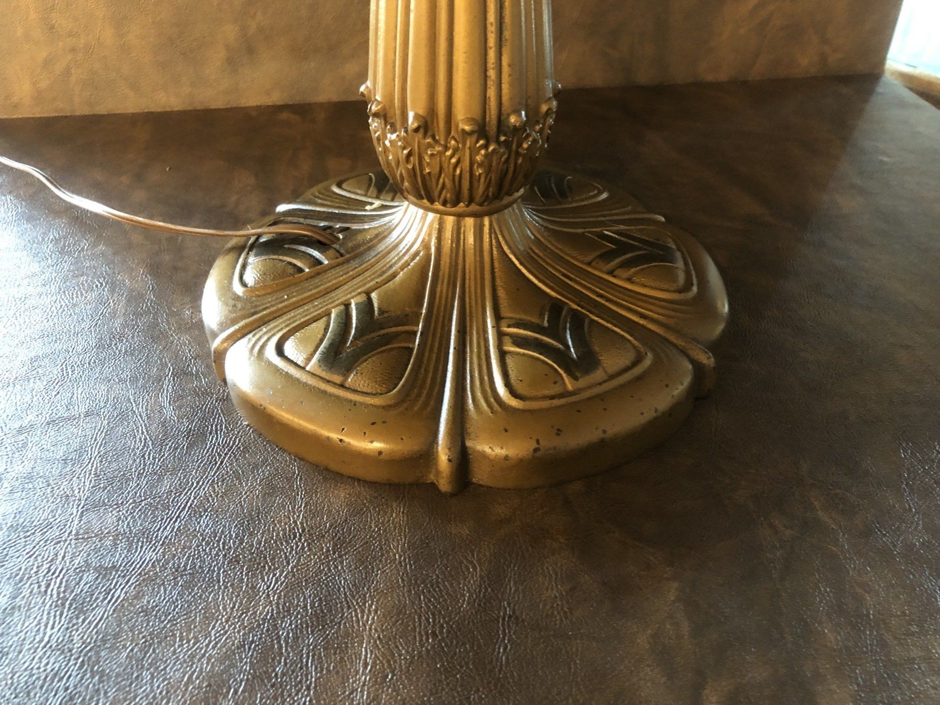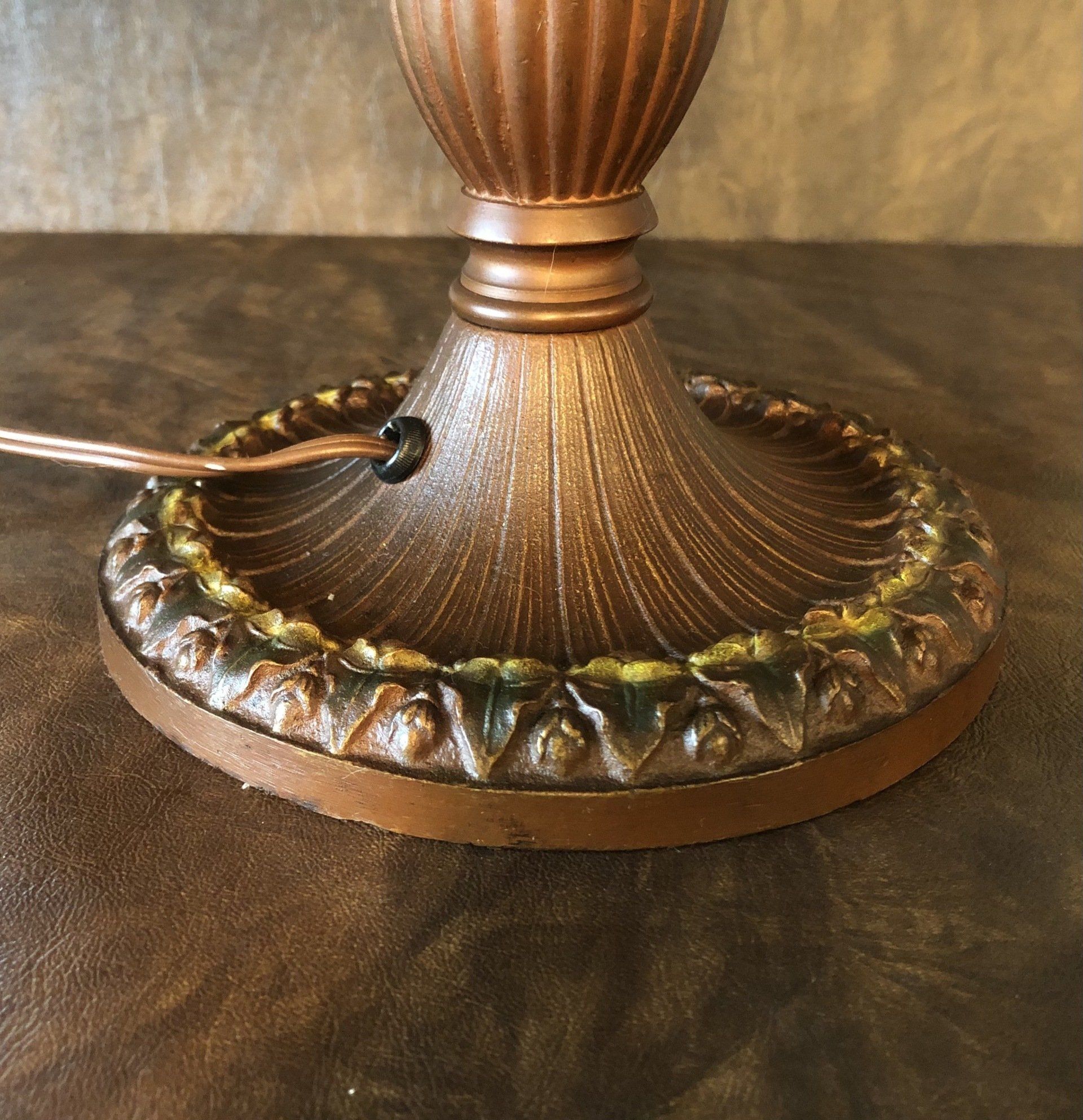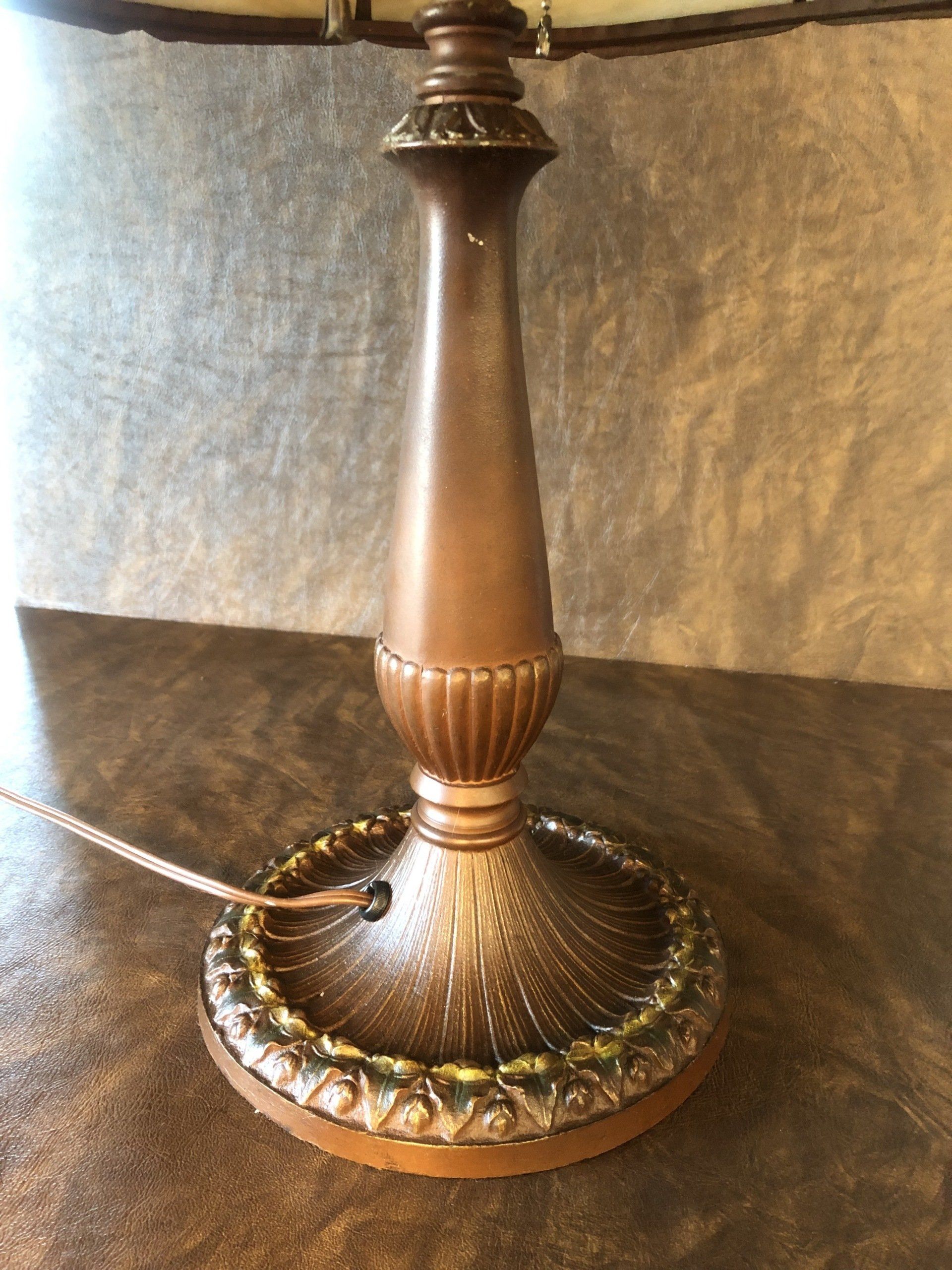 L178. American Rainaud double-light electric table lamp, having a domed shade fitted with seven caramel-slag glass panels in a dark-brown painted cast-metal frame accented with shades of green, supported by a columnar cast metal base painted to match the shade. SOLD