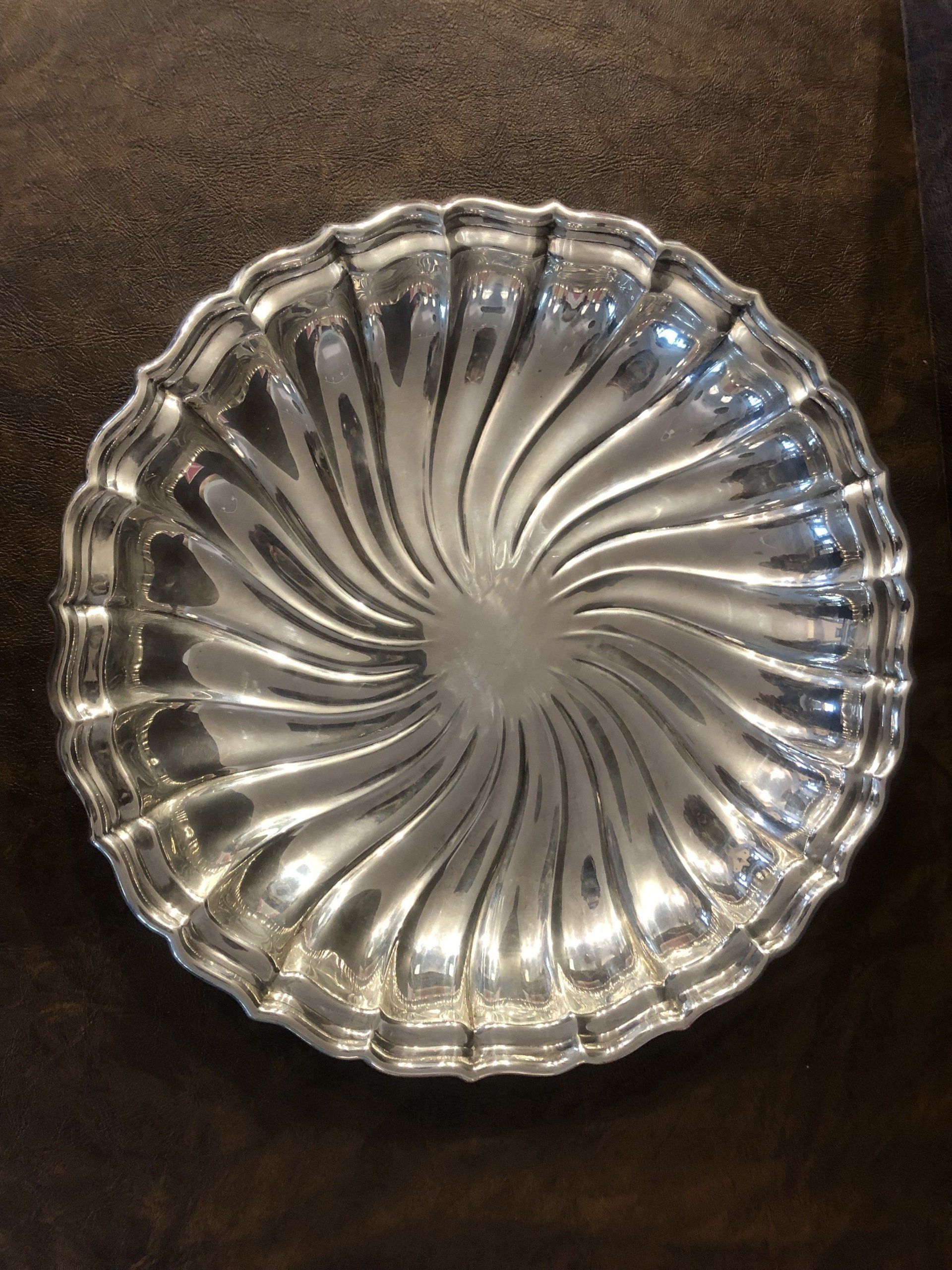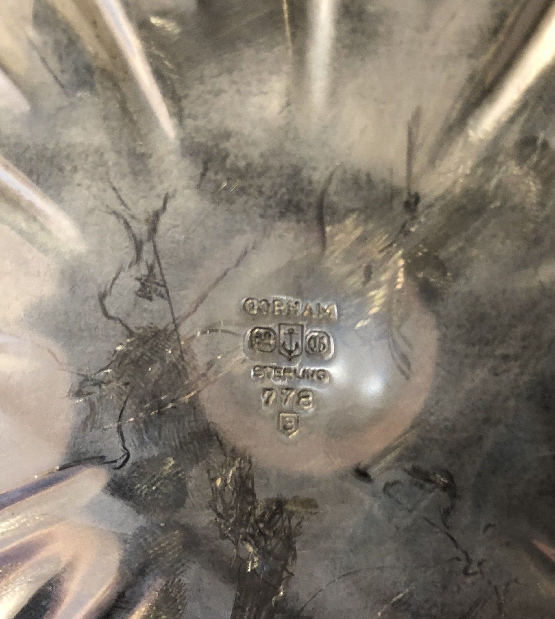 M2065. Fine American Gorham silver round serving tray, a shallow round dish circumscribed by 24 radiating swirled serpentine-shaped ribs sculpting the rim. Made by Gorham Corporation in 1953, design #778. The reverse is stamped with the name of the manufacturer, "GORHAM," stacked above a three-part trademark composed of a ship's anchor in a shield flanked on the left by a right-side profiled lion passant in a shield and on the right by the initial of the manufacturer in Gothic font "G," over an indication of a 92.5% silver standard, the design number "778," and a date mark comprised of the numeral "3" in a shield. Measures 12" diameter and 1.5" tall. Good overall condition with minor table wear. (KA)