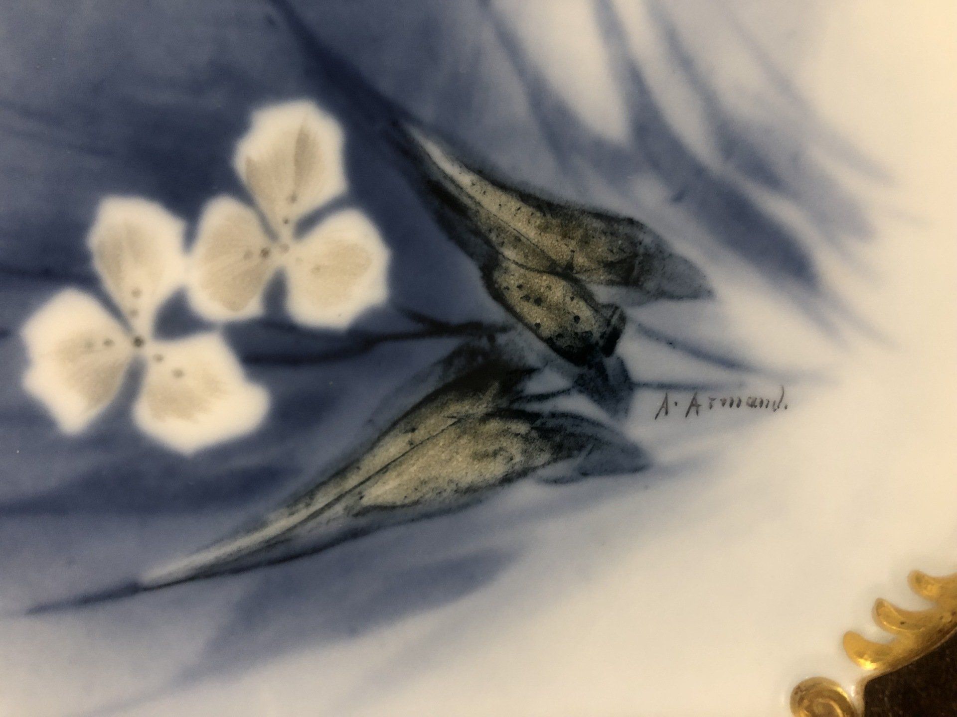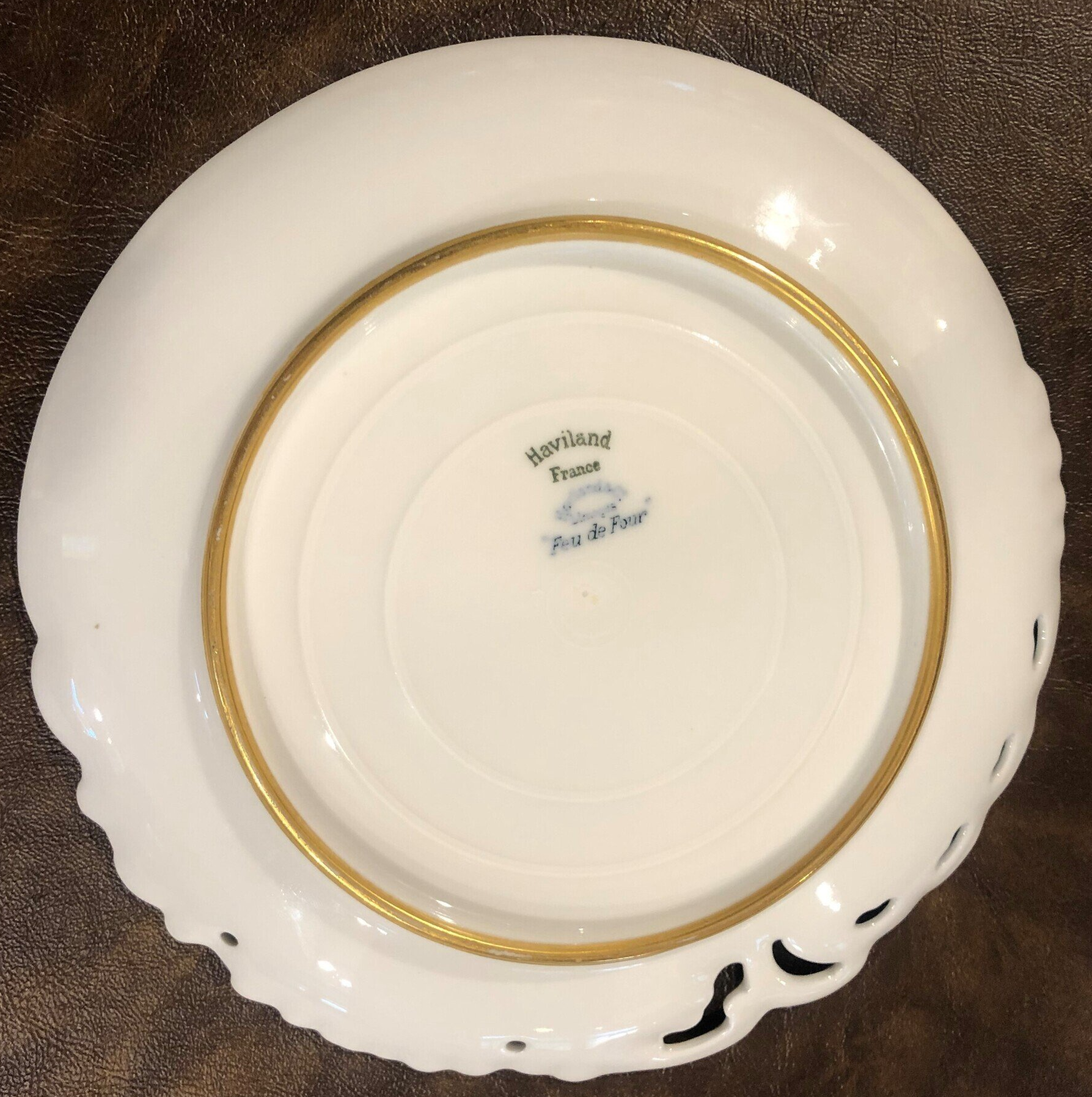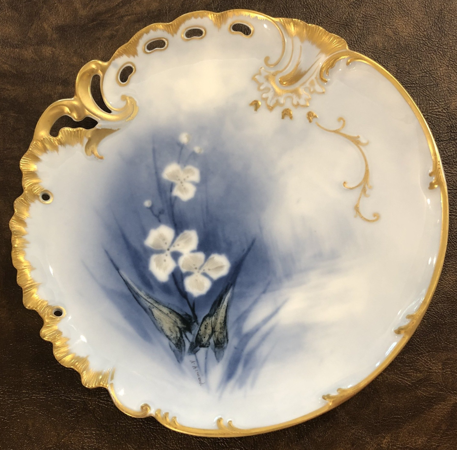 C3663b. Rare Haviland French Limoges Feu de Four painted porcelain hand-painted dessert plate, Art Nouveau and Oriental influences, using the Marseilles shape, a shallow dished form sculpted with a pierced and molded border of conventionalized “C”-scrolls chained with scrolled leaf and floriforms which are embellished with pendant bellflowers and scrolling vines, underglaze printed in flowing cobalt-blue with a large off-center flowering arrowhead plant overlying a watery shoreline with reeds, accented in overglaze grey and black on the flowering plant, and richly finished by hand with metallic-gold trimming the molded border and even edging the foot rim. SOLD.