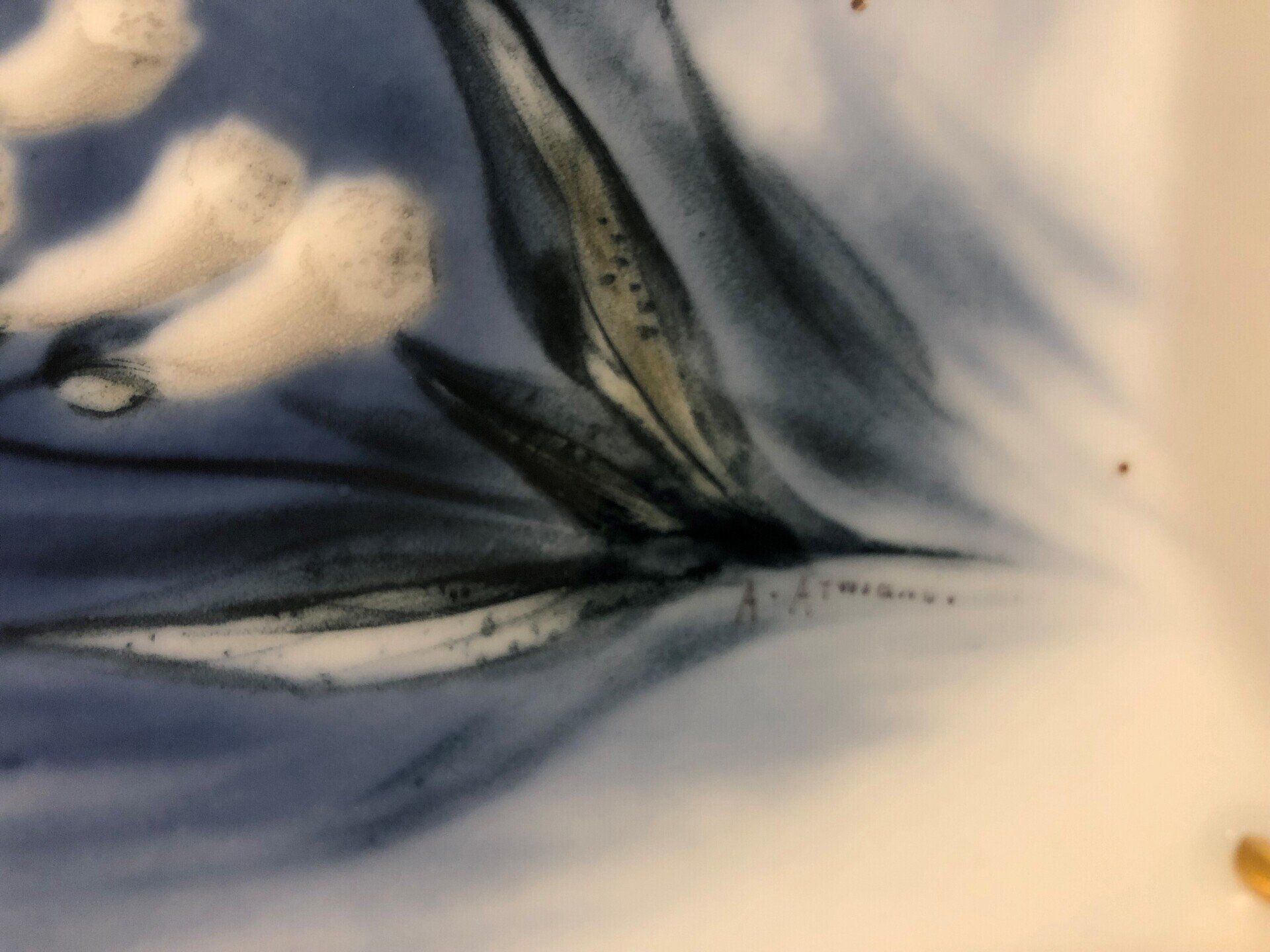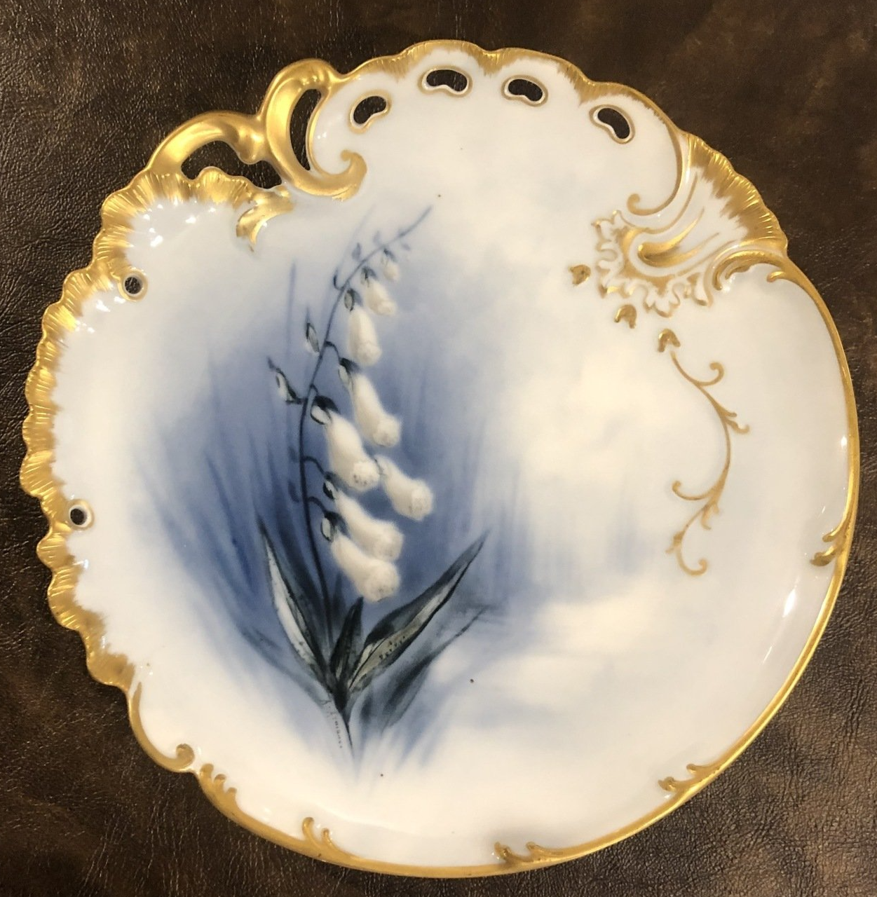 C3662a. Rare Haviland French Limoges Feu de Four painted porcelain hand-painted dessert plate, Art Nouveau and Oriental influences, using the Marseilles shape, a shallow dished form sculpted with a pierced and molded border of conventionalized “C”-scrolls chained with scrolled leaf and floriforms which are embellished with pendant bellflowers and scrolling vines, underglaze printed in flowing cobalt-blue with a large off-center flowering foxglove plant overlying a watery shoreline with reeds, accented in overglaze grey and black on the flowering plant, and richly finished by hand with metallic-gold trimming the molded border and even edging the foot rim. SOLD.