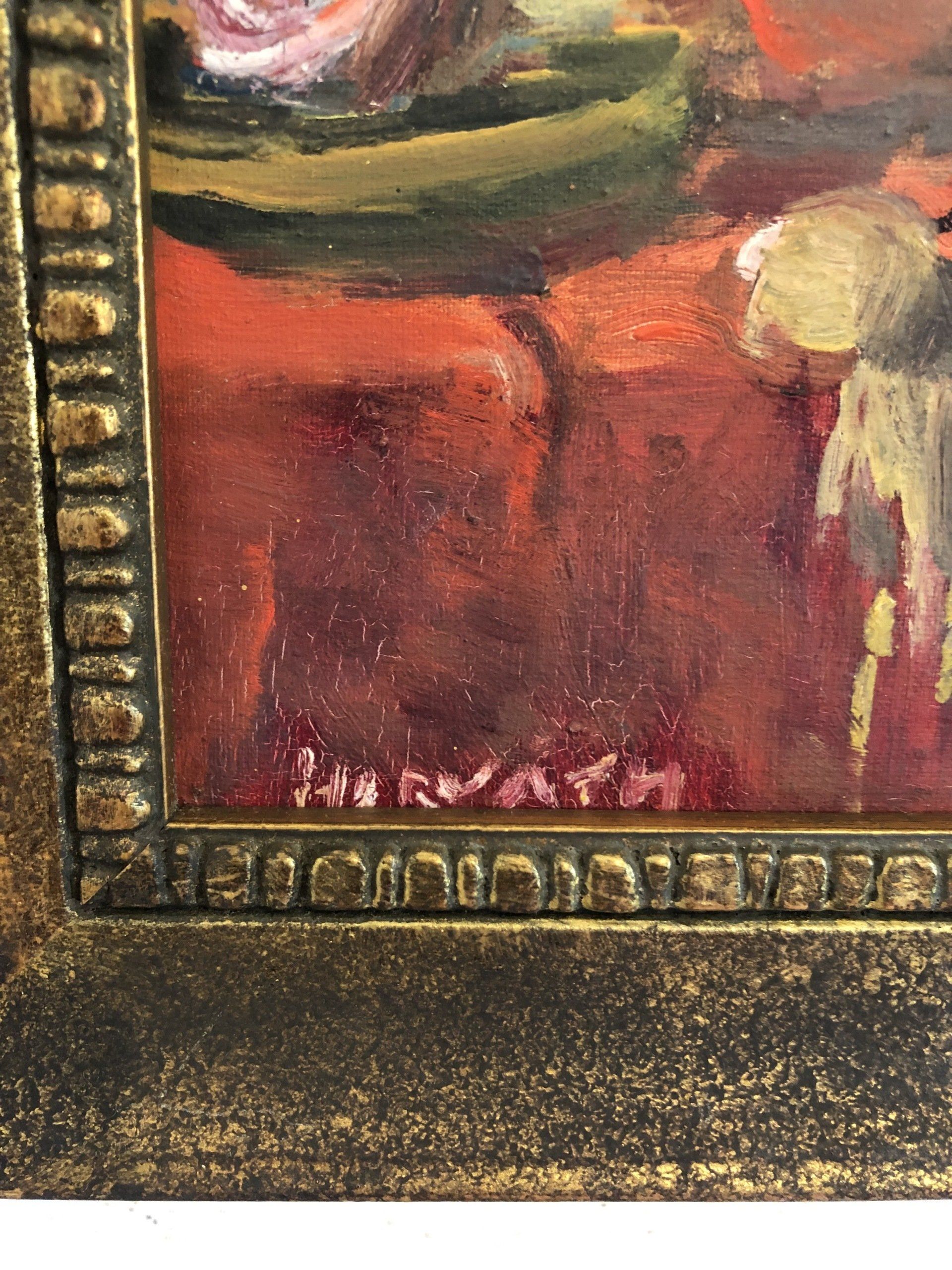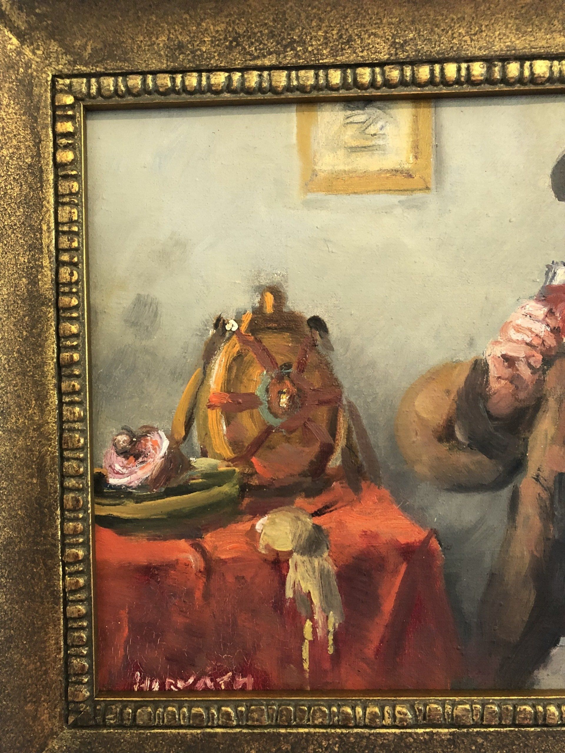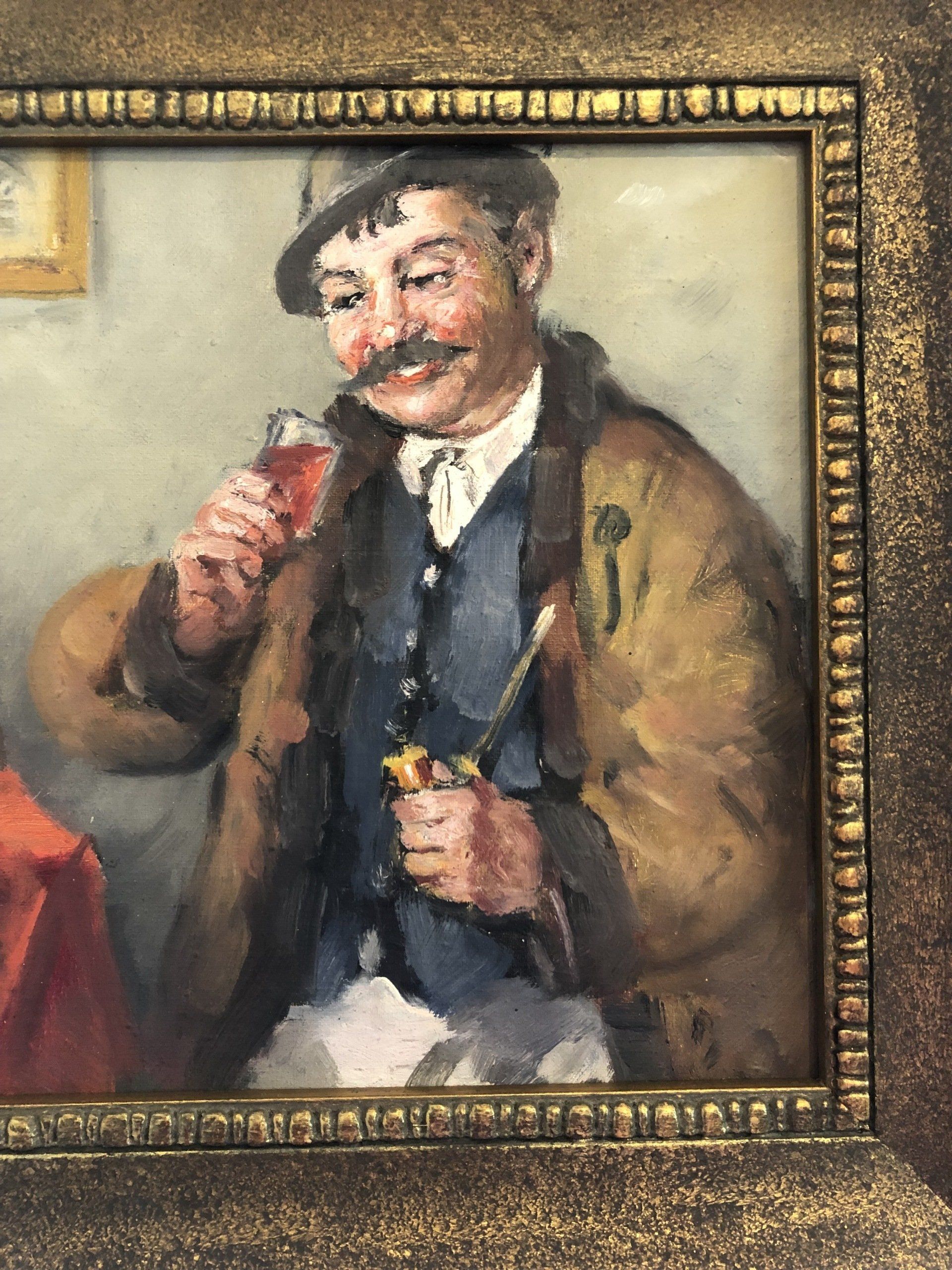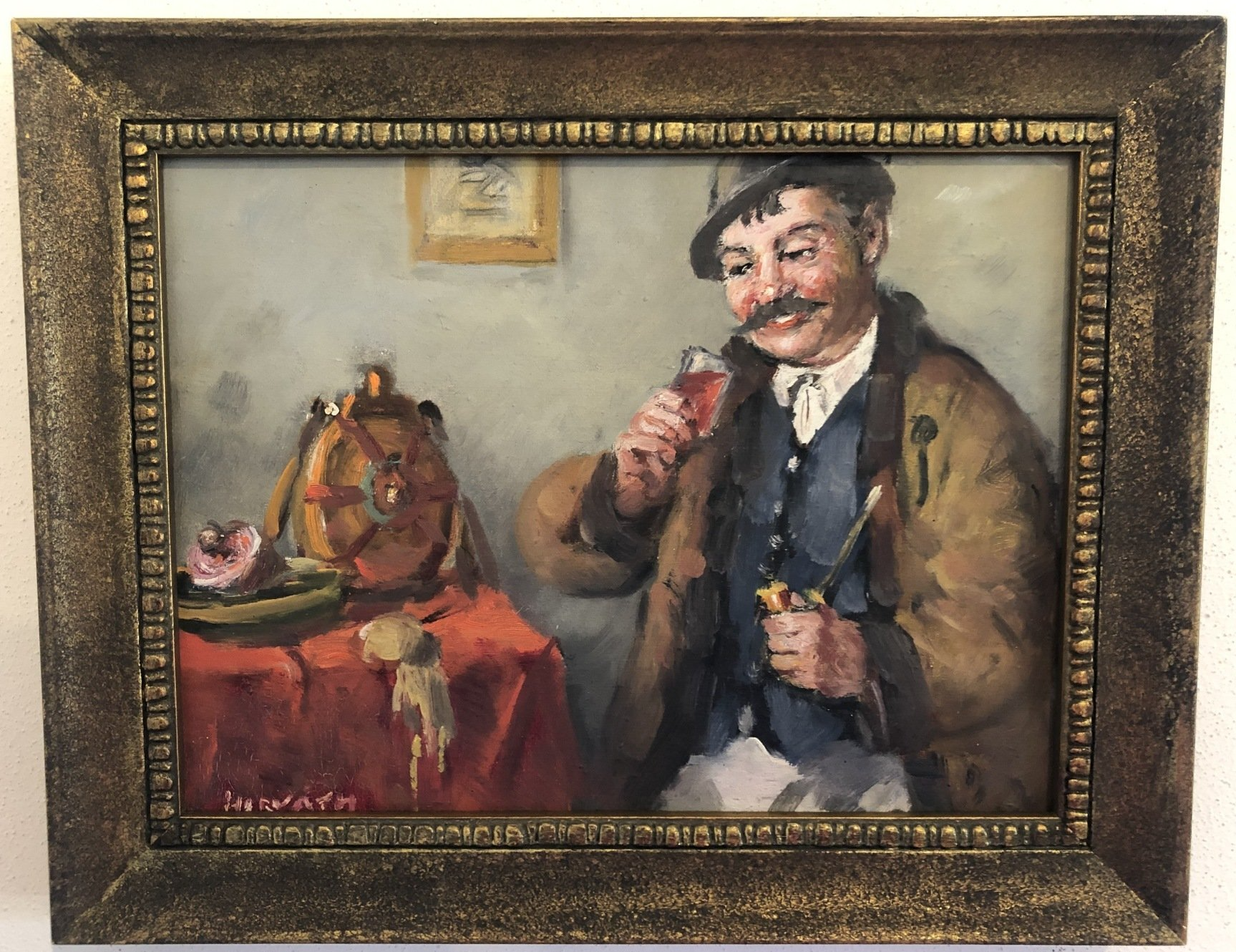 F194. Hungarian genre painting, by Andor G. Hovarth (1876-1966), oil on canvas, depicting a man enjoying a drink and a pipe seated at a table, mounted in a modern dark-gold gilded gesso wooden frame. $295.00.