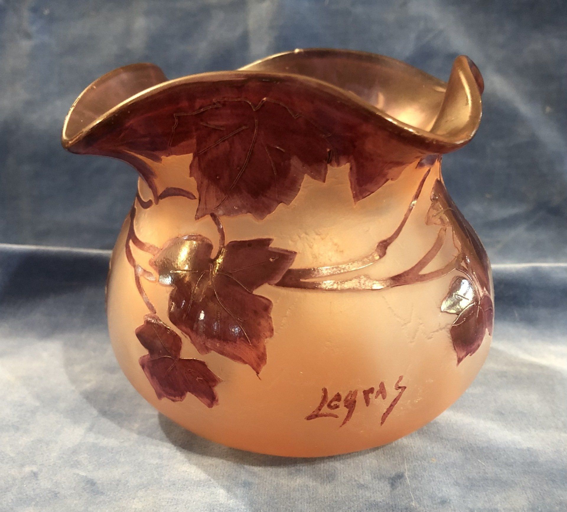 G2521. Art Nouveau French cameo acid-cut back glass vase, signed Legras, having a blown-molded ogee-molded form of light-peach colored glass, optic-molded with subtle internally rounded ribs, and decorated with an amethyst-purple stained vine against a frosted ground, wreathing a deeply crimped rim and trailing onto the lower walls with large palmate leaves. Attributed to Legras and Cie, glassworks of St. Denis in Paris, France, dating from the late 19th century to the early 20th century. Concave wheel-polished pontil. Good condition. Measures 4" tall and 5 1/8" diameter. SOLD