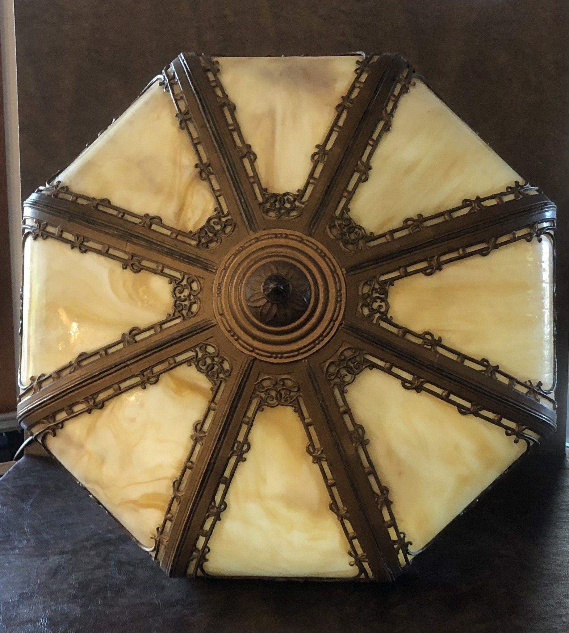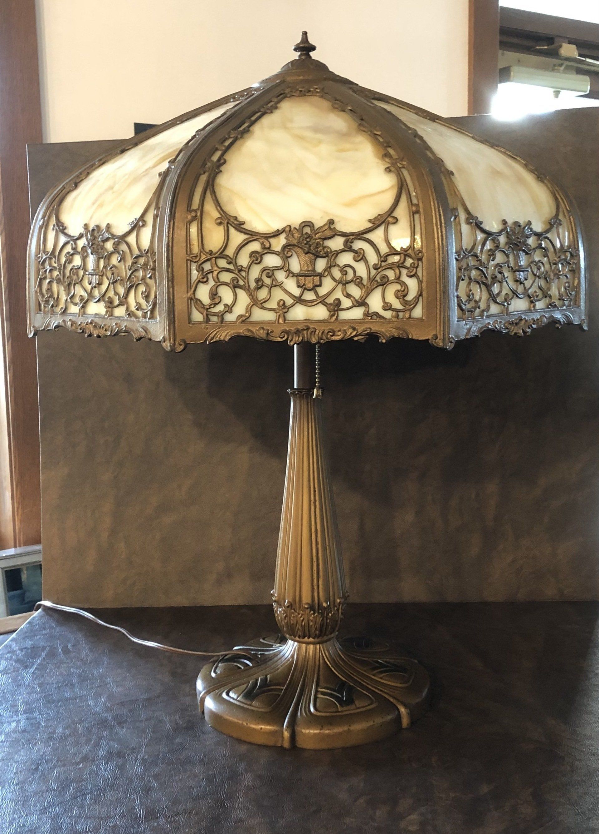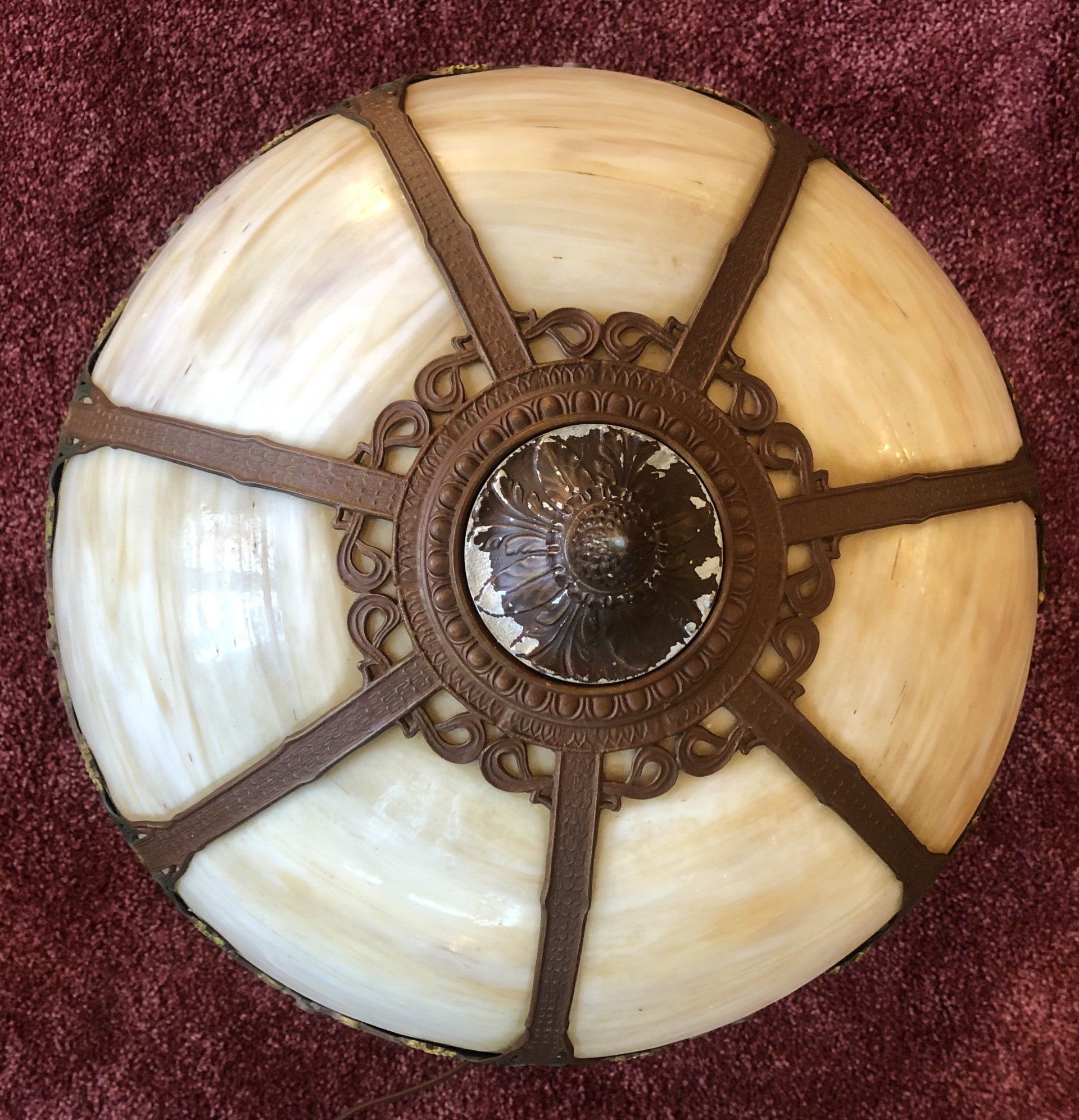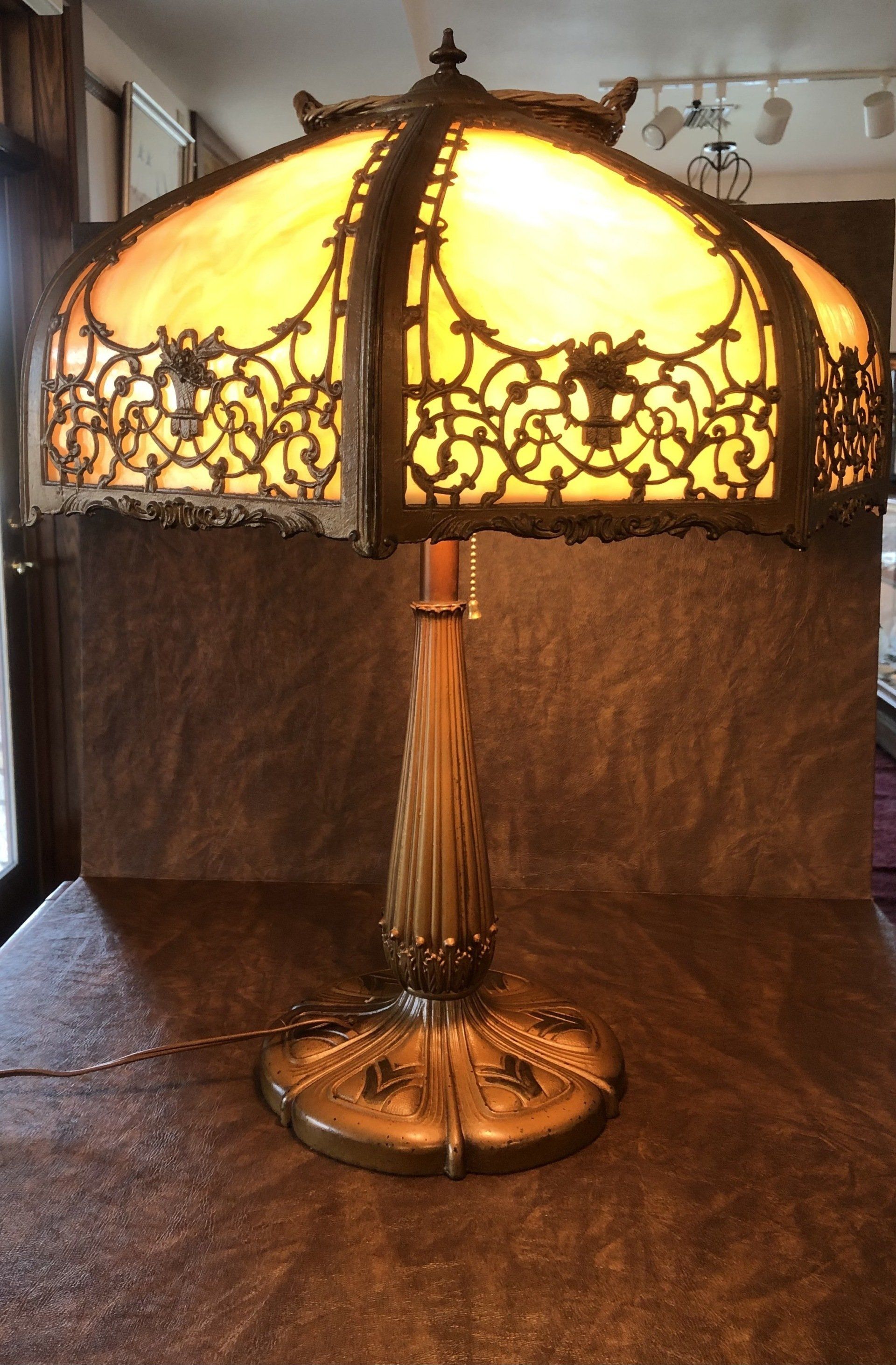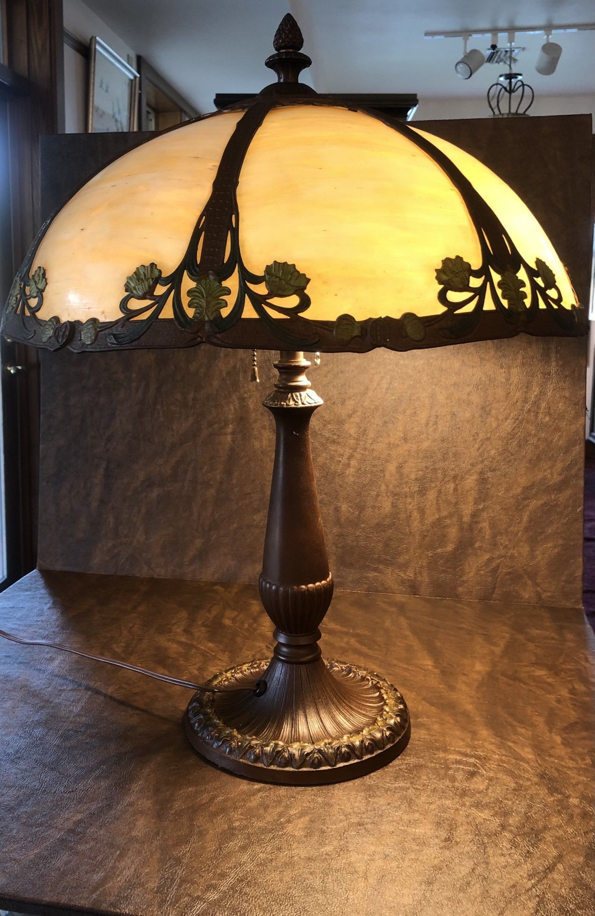 L177. American double-light electric table lamp, having eight caramel-slag glass panels fitted to a golden-brown bronze painted metal domed shade, supported by a matching painted metal base.
