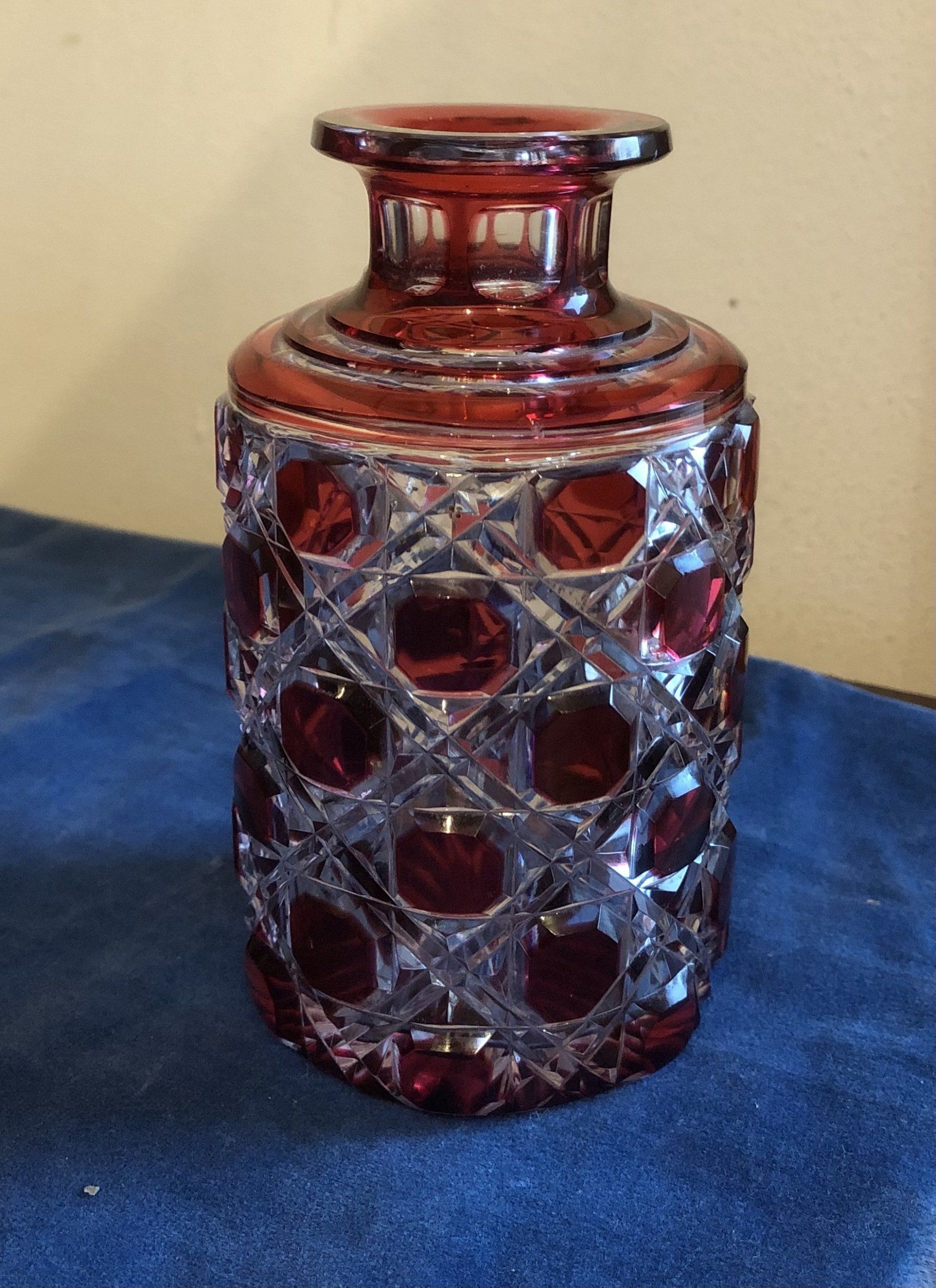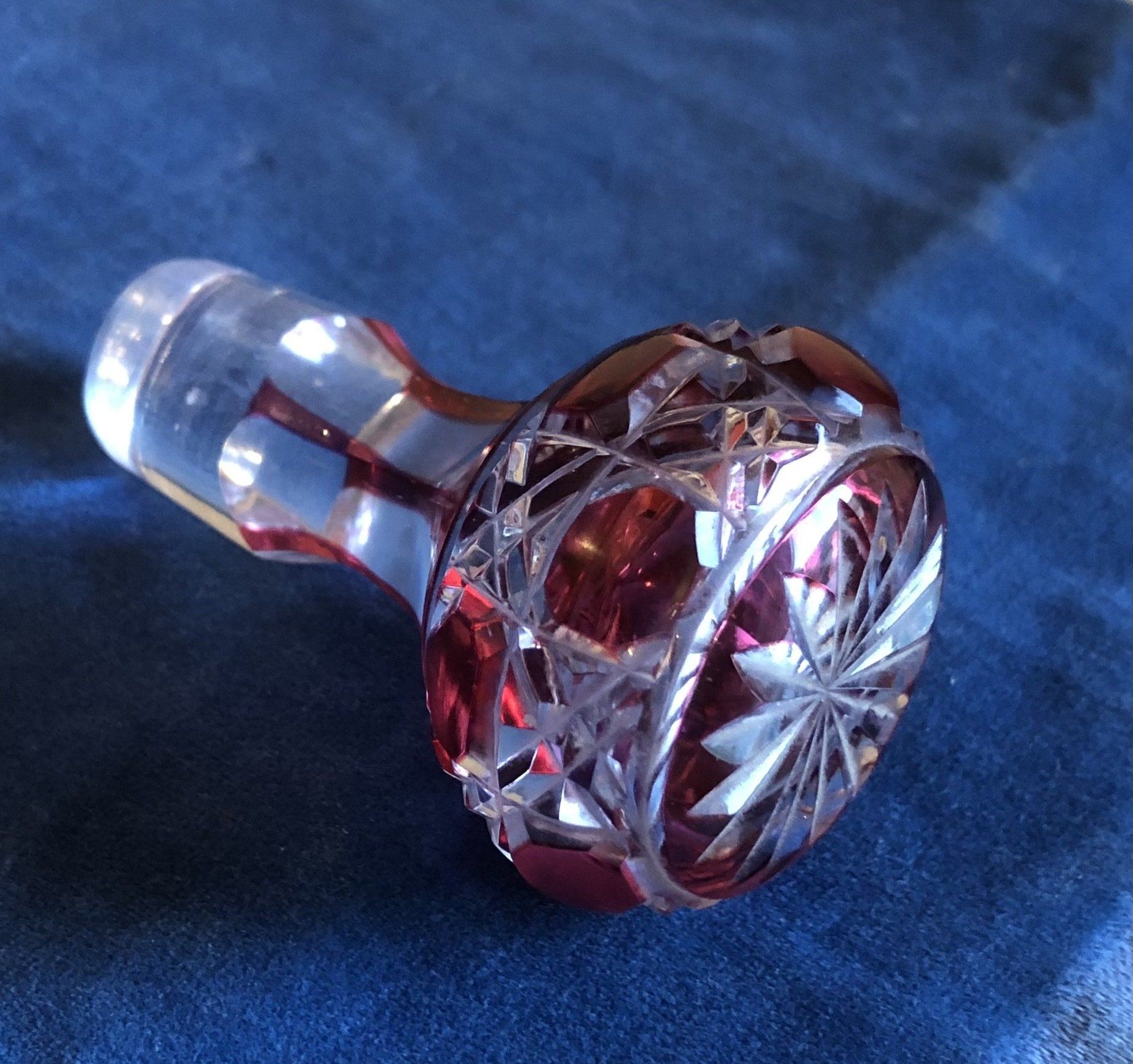 G2509. Exceptional French St. Louis cranberry-red cased colorless wheel-cut Chair-cane pattern pair of leaded glass colognes with pattern-cut air-trap stoppers. SOLD. Pair only.