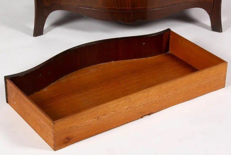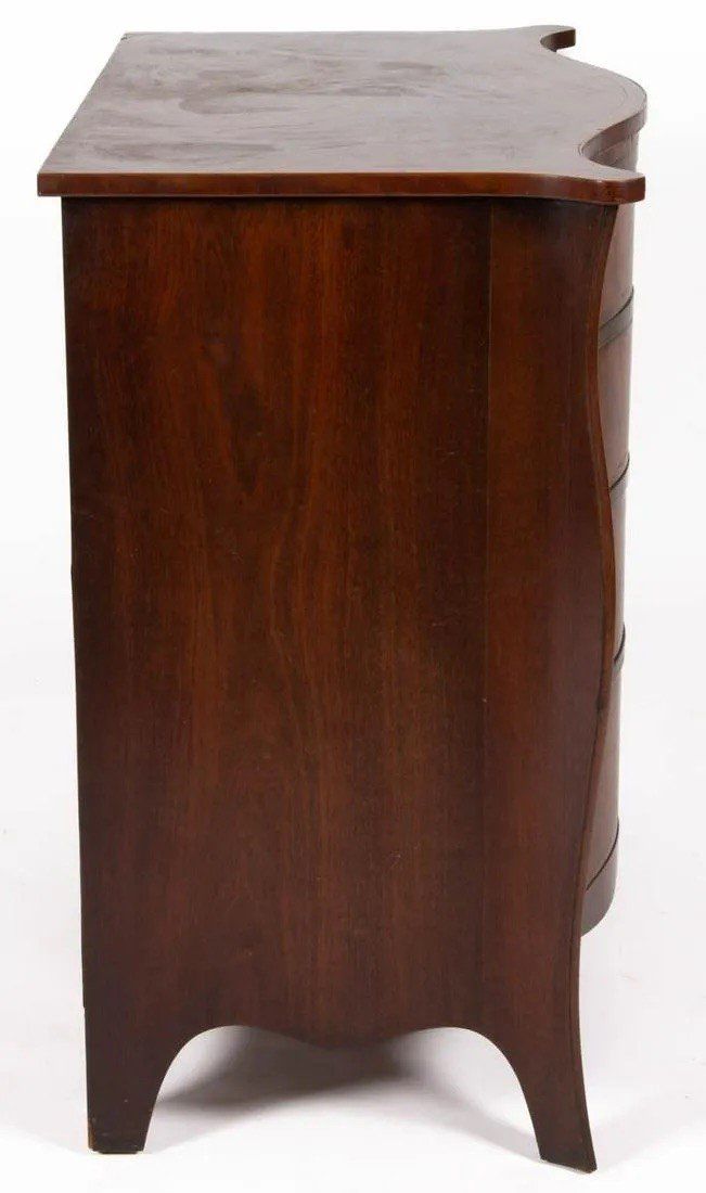 Mahogany serpentine-front chest of drawers, surfaced in bookpage matched flame-figured veneer with cross-banding and line-inlay, fitted with a pull-out tray surfaced in tooled leather above four drawers each having two brass laurel-wreath ring-pulls, above a serpentine-and-scallop valence, raised on two flared front feet.